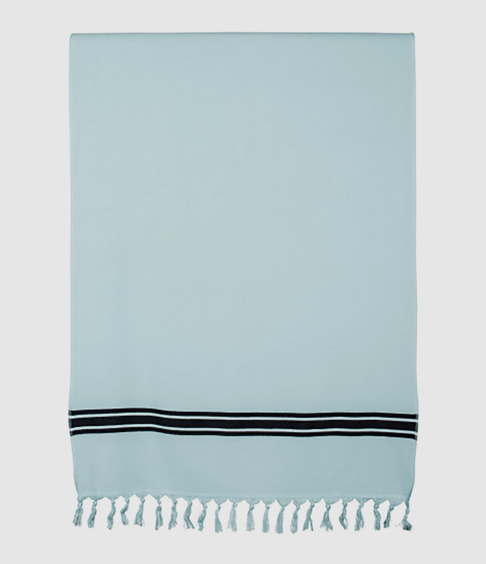Drap de bain en coton bleu clair. Bandes noires. Bords frangés.