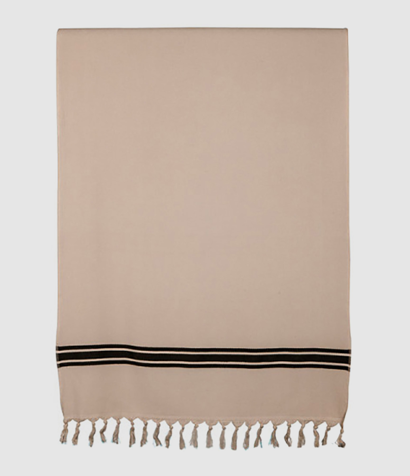 Drap de bain en coton taupe. Bandes noires. Bords frangés.