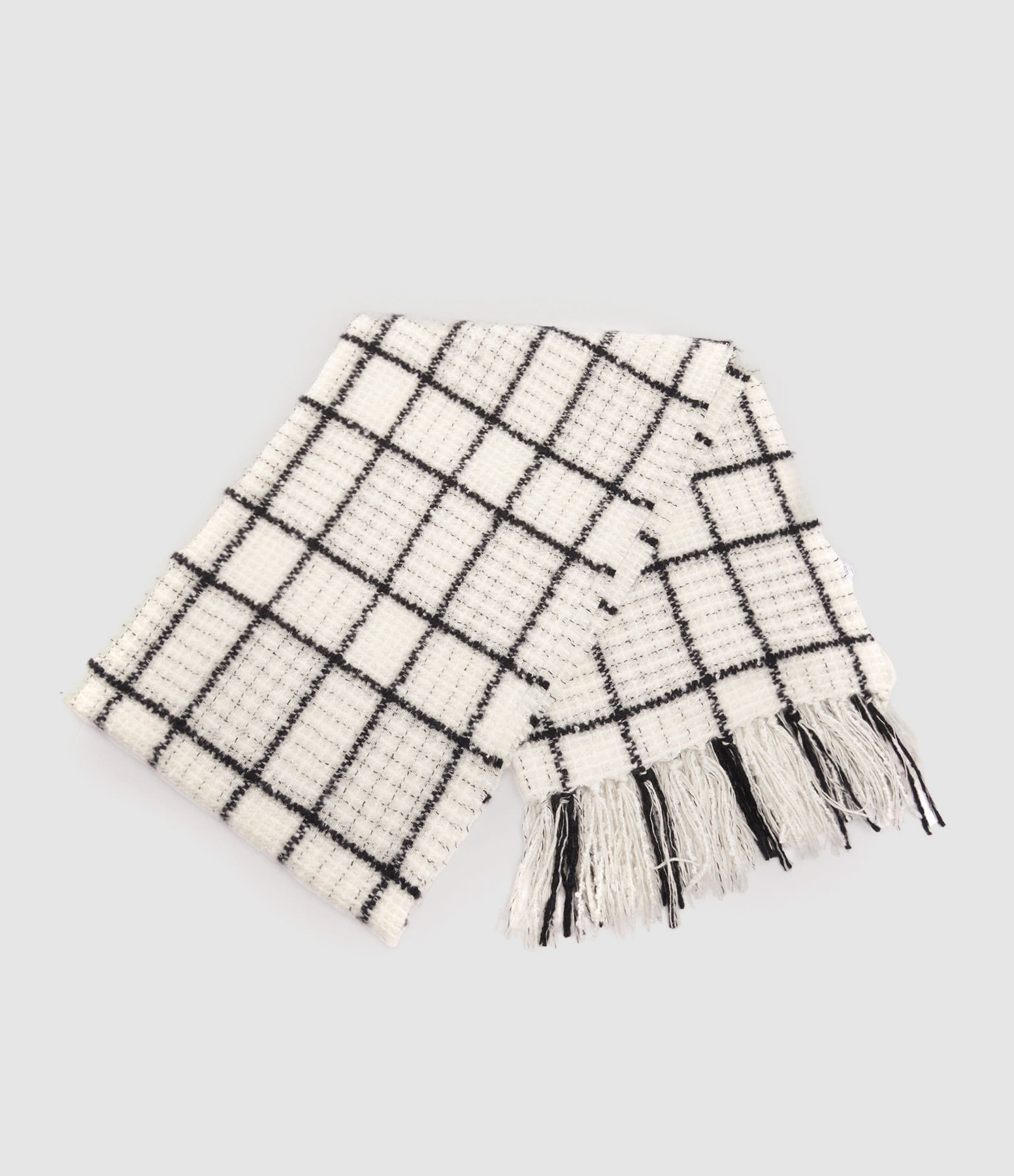Écharpe en cachemire et soie à carreaux noir et blanc. Bords frangés.