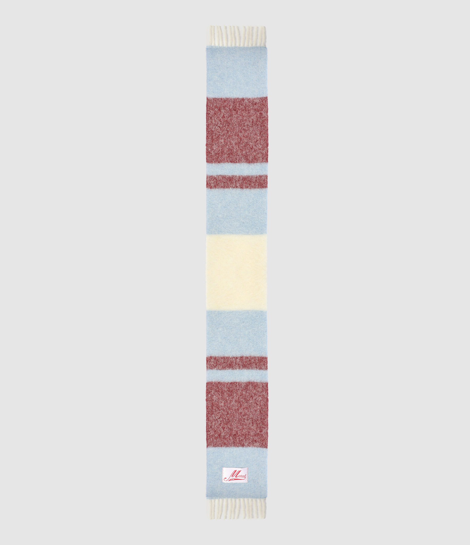 Echarpe en laine mélangée rayée bleu et rose. Bords frangés. Etiquette "MARNI MILANO" à l'extrémité.