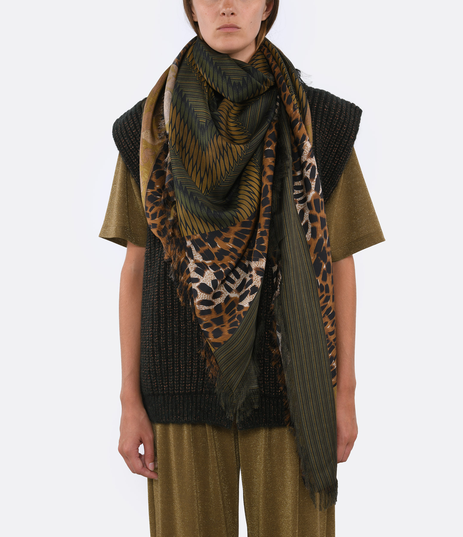 Echarpe en soie à imprimé vert et marron. Bords frangés.
