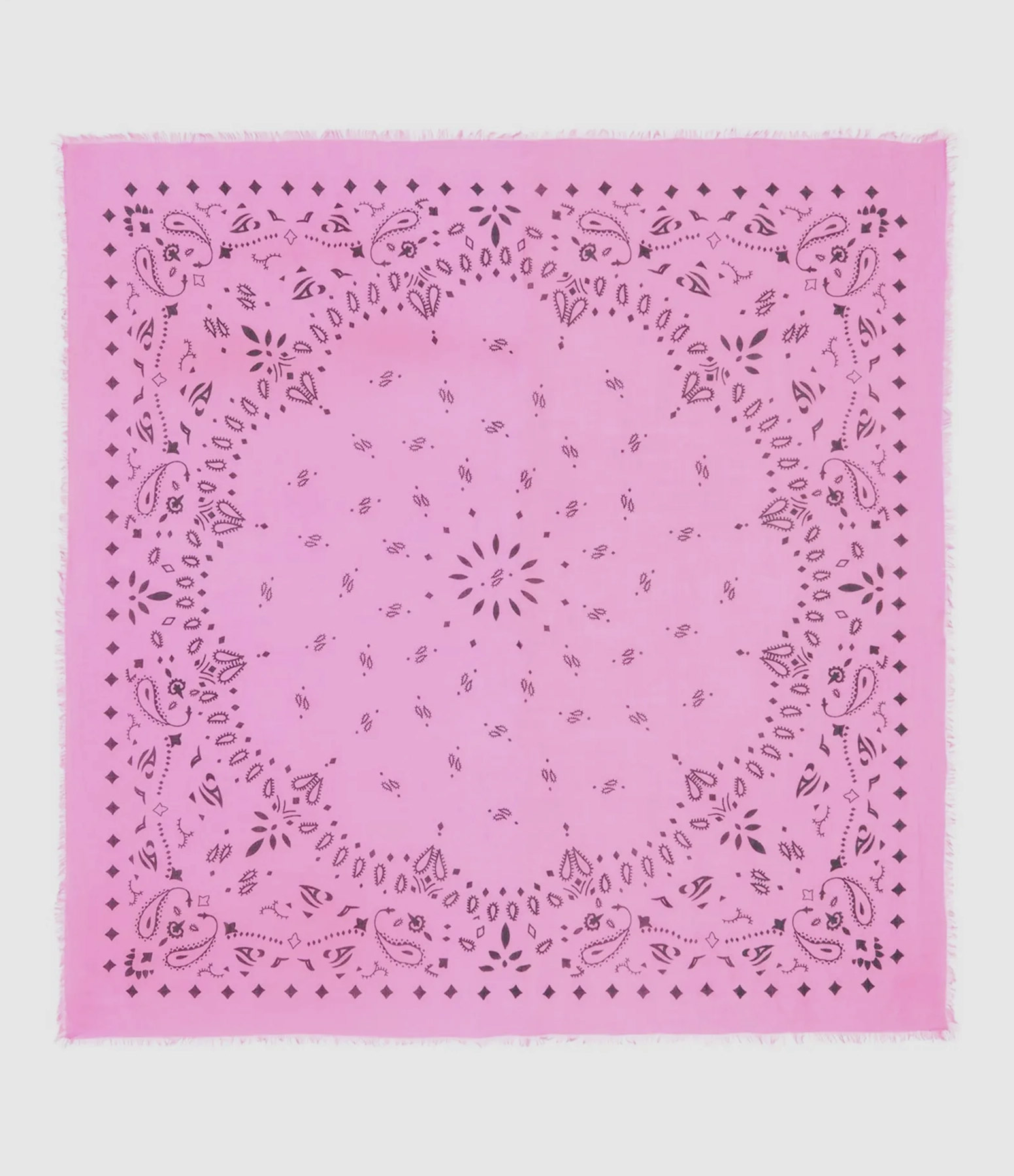 Echarpe en cachemire rose, motif bandana noir. Bords effiles.