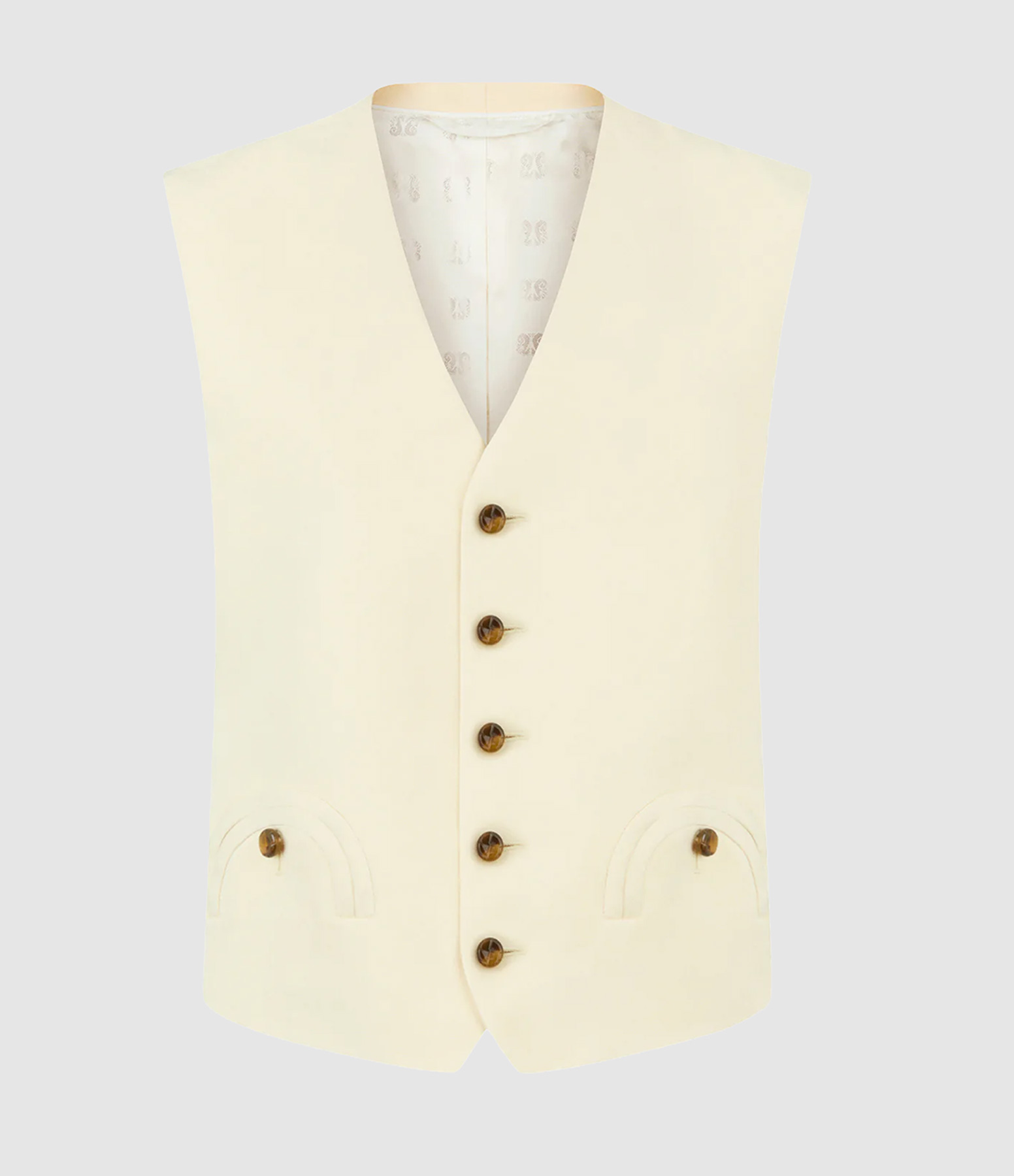 Gilet pour femme en lin crème et mélange de soie. Modèle sans manches. Coupe légèrement ample. Boutons marron brillant. Doublure couleur crème.