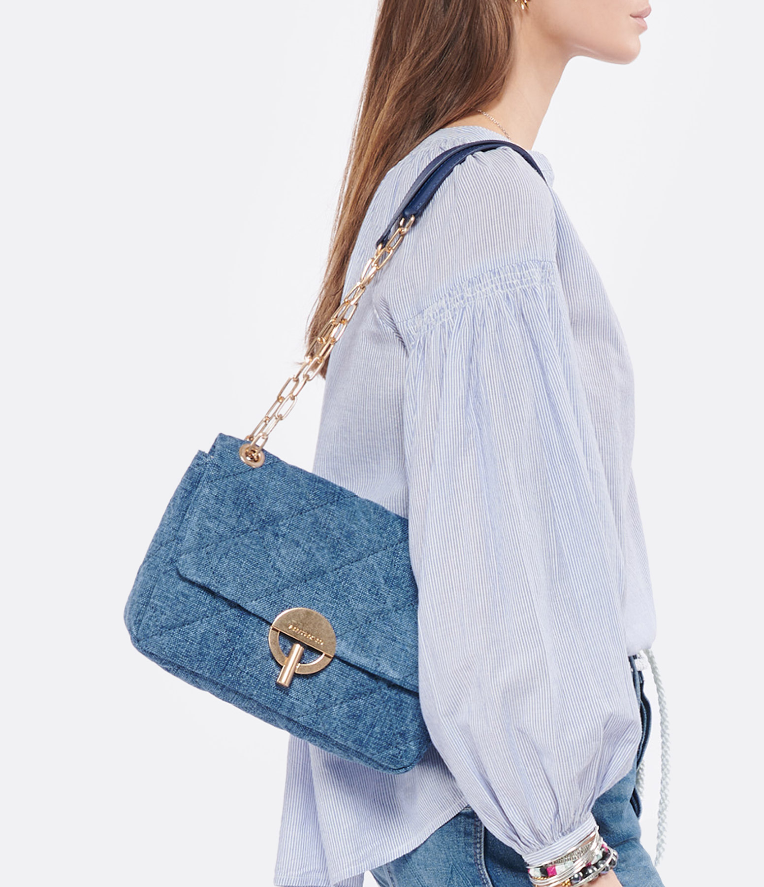 Sac bandoulière à rabat en lin matelassé bleu. Bandoulière en chaîne et poignet en cuir, possibilité de porter en double chaîne Fermeture par boucle métallique. Intérieur doublé en coton avec une poche zippée et une poche plaquée.