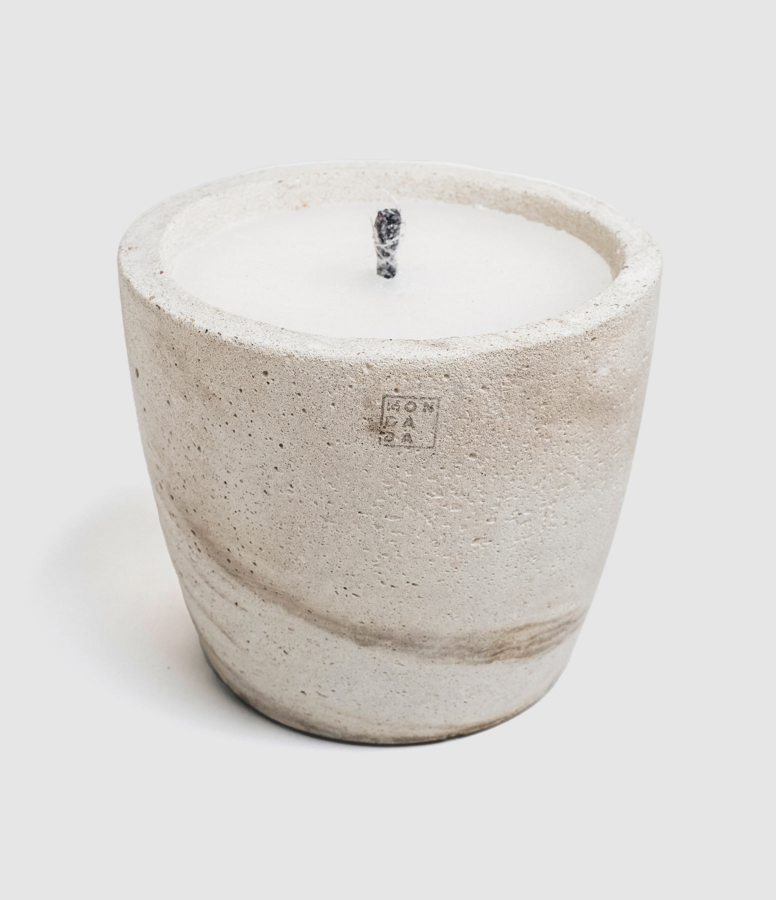 Bougie d'extérieur anti-moustique, une mèche, dans un pot en béton écru.