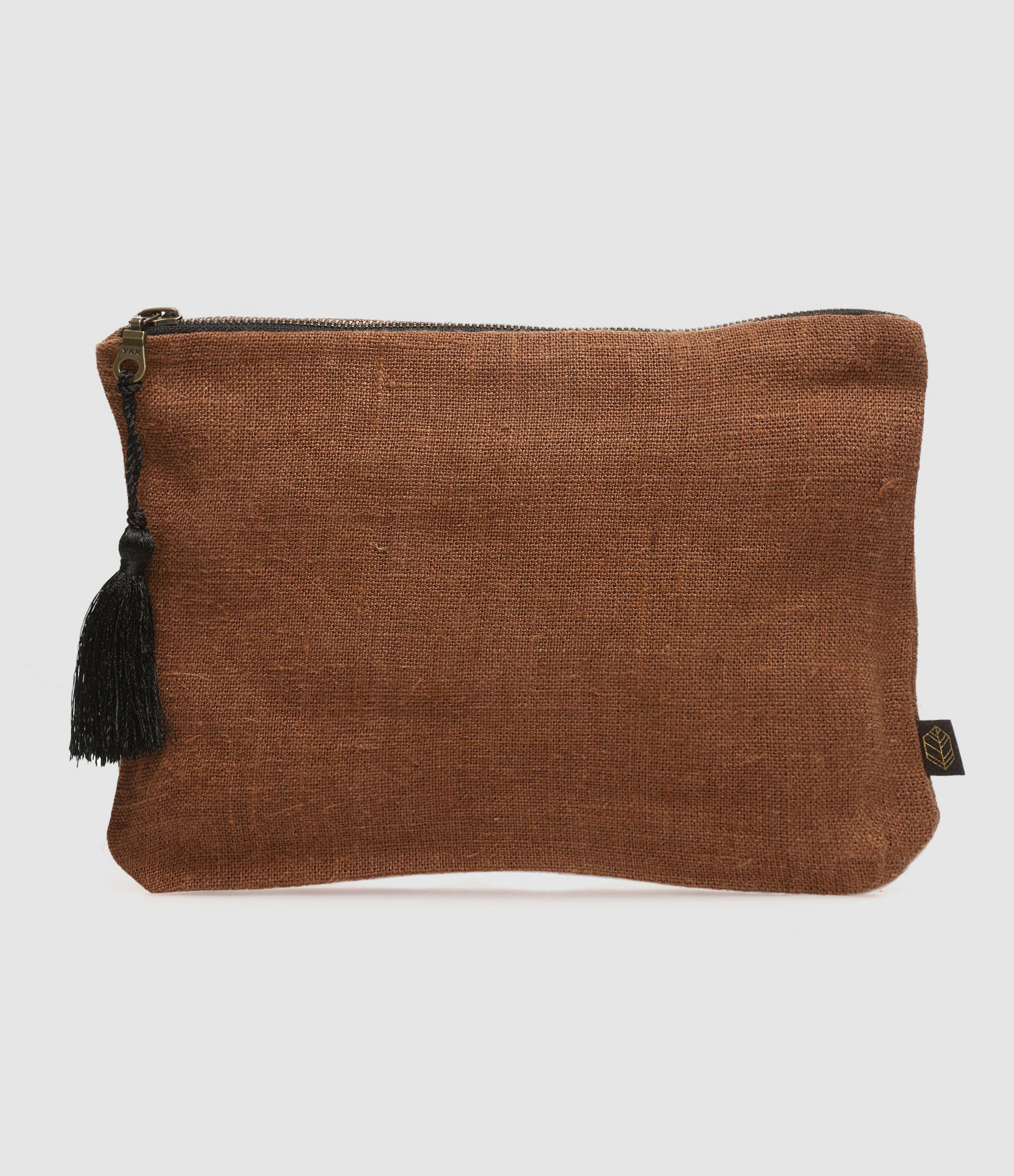 Pochette en lin marron. Fermeture éclair avec pompon.
