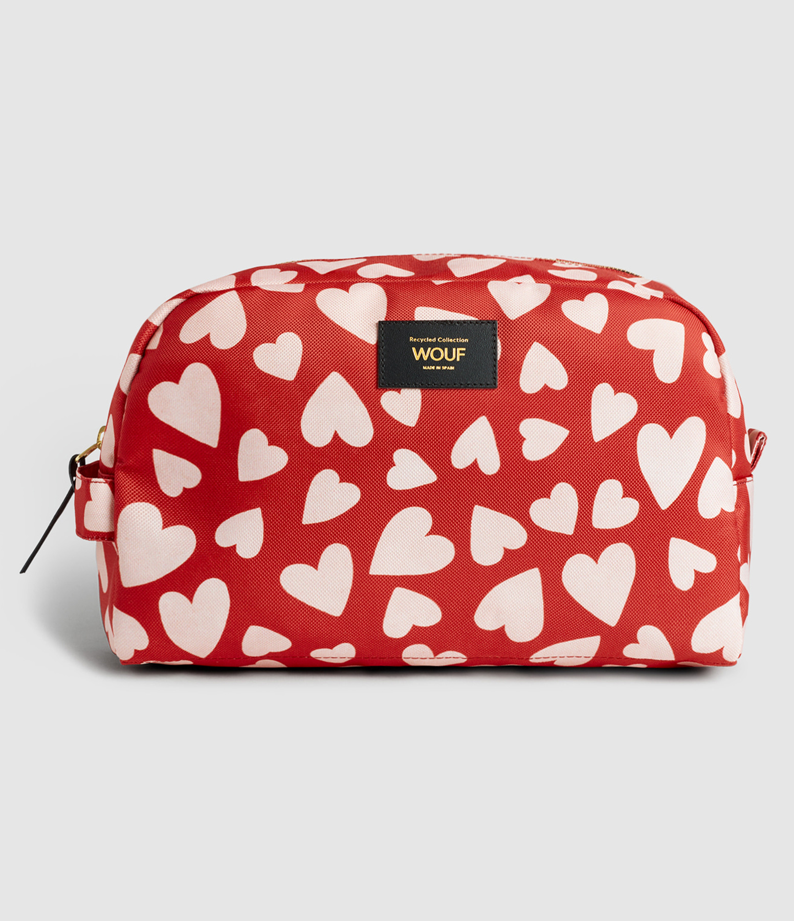 Trousse de toilette arrondie imprimée cœur rouge et blanc. Fermeture glissière YKK recyclée. Résistante à l'eau. Encres écologiques.