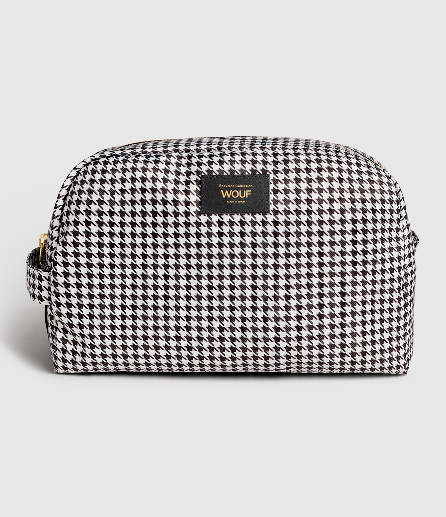 Trousse de toilette arrondie imprimée pied de poule noir et blanc. Fermeture glissière YKK recyclée. Résistante à l'eau. Encres écologiques.