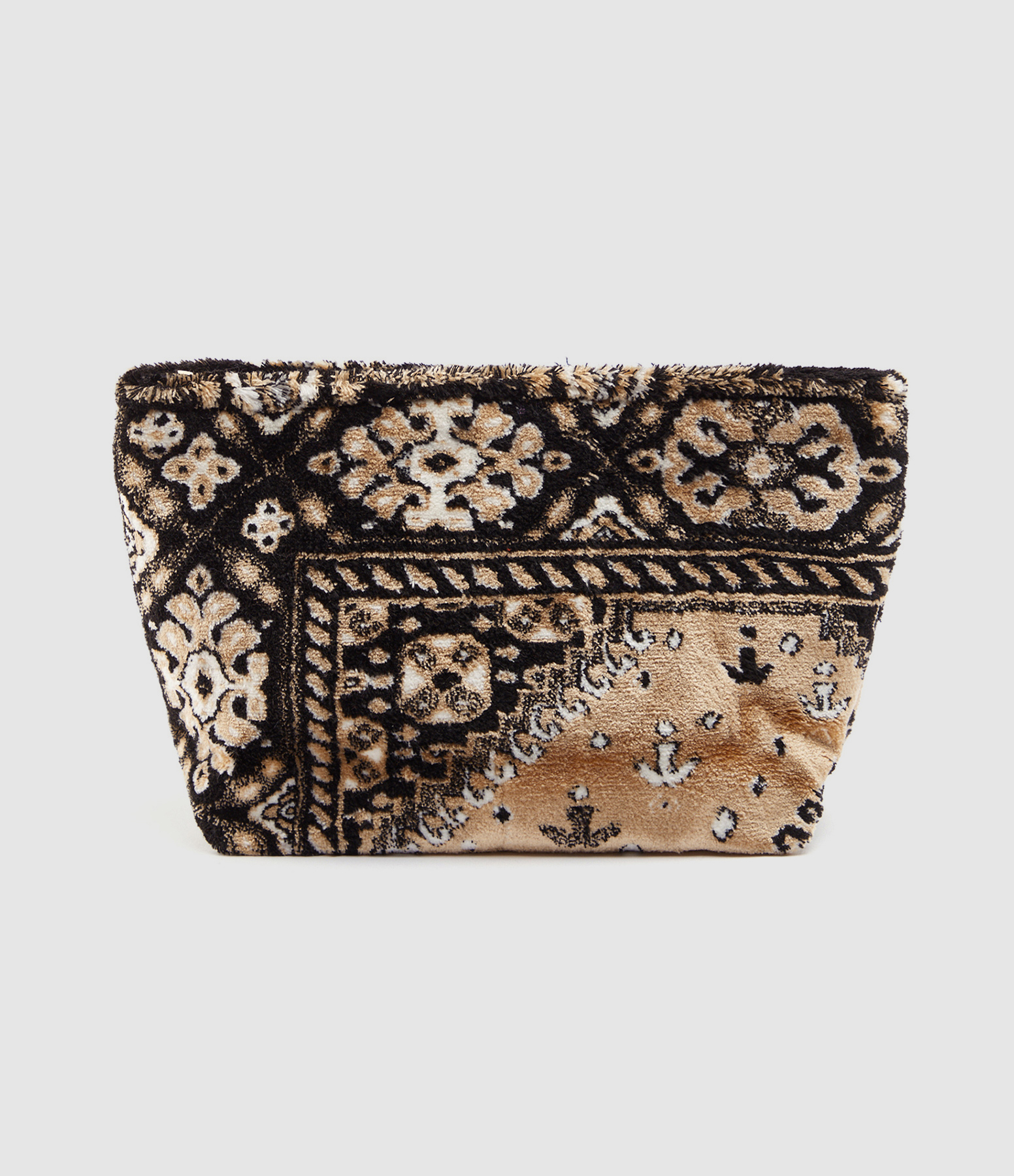 Trousse en coton à motifs beige. Fermeture par un zip orné d'une languette en coton. Intérieur doublé en coton.