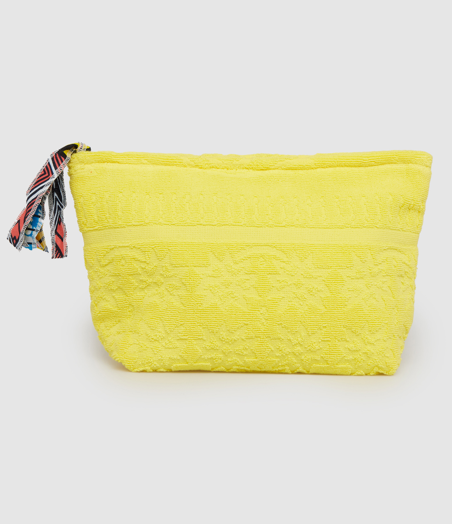 Trousse en serviette éponge jaune à motifs texturés. Fermeture par un zip. Intérieur doublé en tissu à imprimé wax (motifs africains).