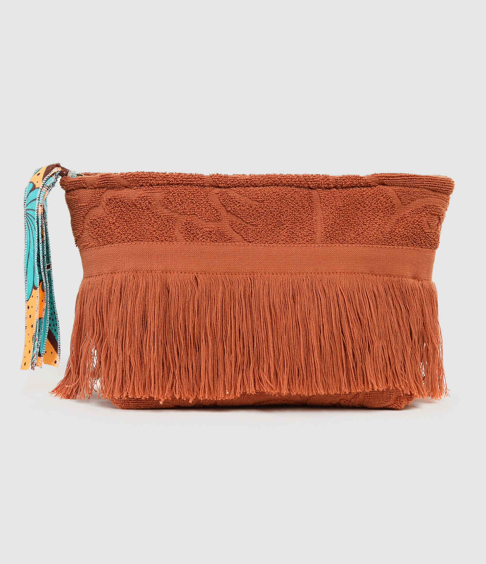 Trousse fauve en serviette éponge à motifs texturés, ornée de franges. Fermeture par un zip orné d'un pompon. Intérieur doublé en tissu à imprimé wax (motifs africains).