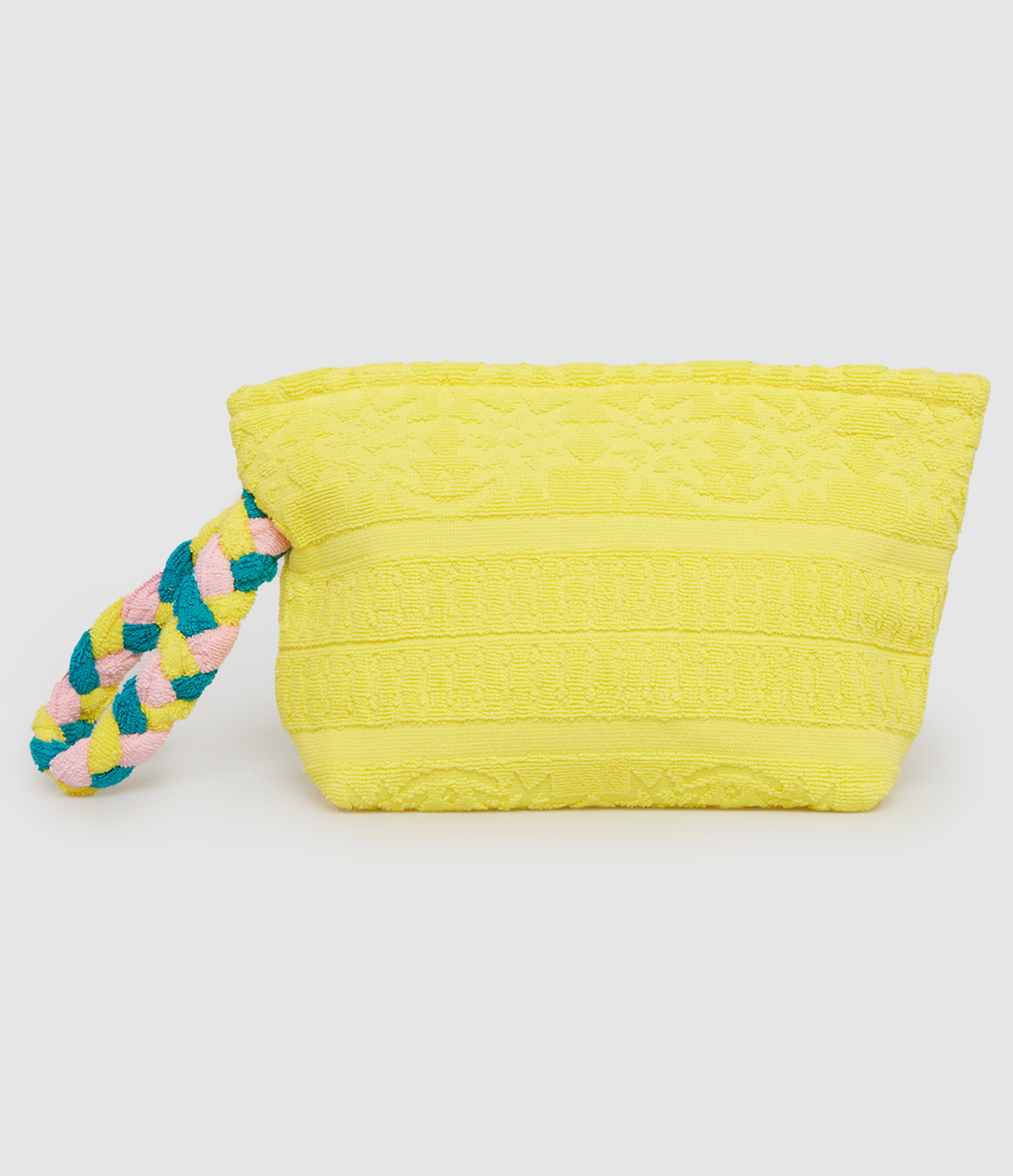 Trousse en serviette éponge jaune à motifs texturés. Fermeture par un zip. Intérieur doublé en tissu à imprimé wax (motifs africains).