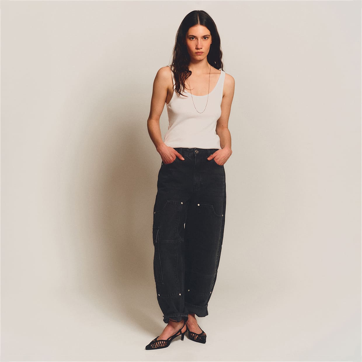 Le jean ballon, également appelé barrel jeans ou barrel leg, se reconnaît à sa jambe légèrement arrondie. Ample au niveau des cuisses puis resserré vers la cheville, il apporte une silhouette moderne et tendance..