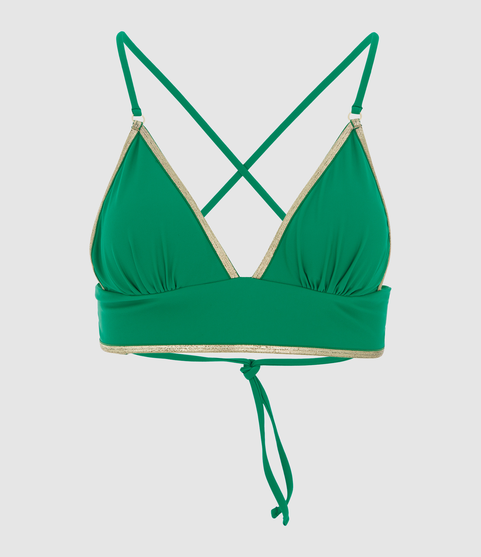 Haut de maillot de bain tringle vert orné d'un liseré doré. Deux bretelles se croisant dans le dos. Sans attache. Entièrement doublé et élastiqué pour plus de confort et de maintien.