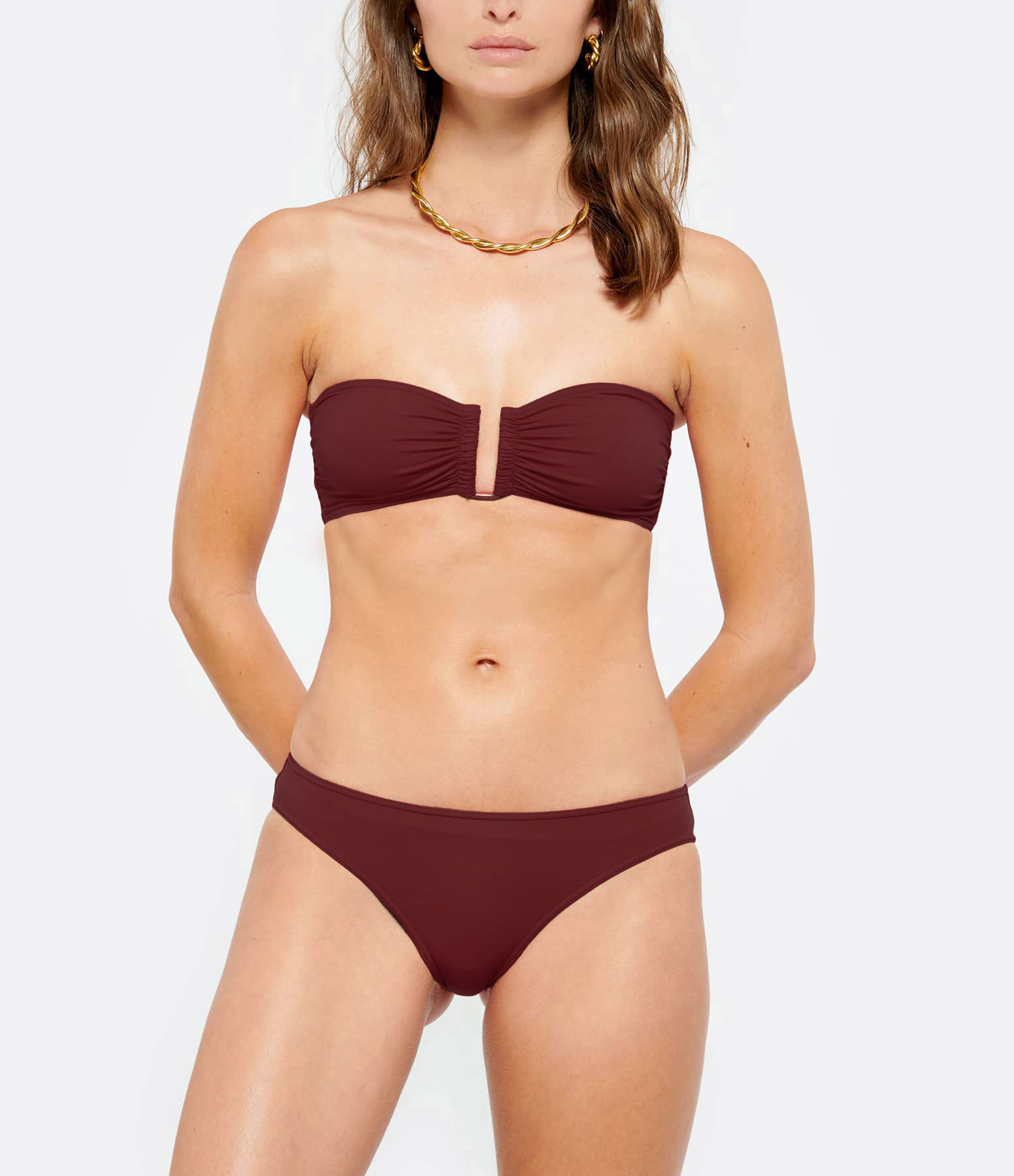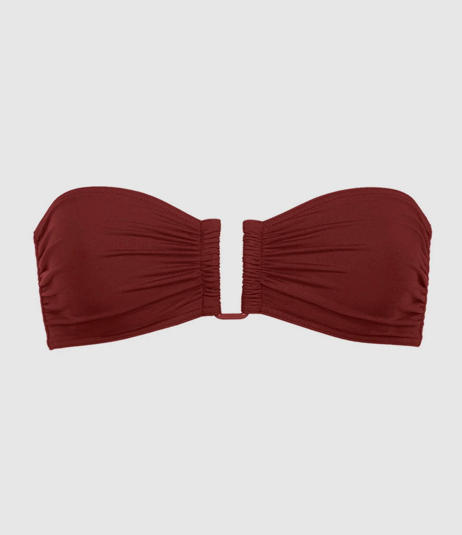 Haut de maillot de bain bandeau bordeaux. Fronces. Bonnets séparés par une ferrure en U. Baleines sur les côtés. Fermeture par bélière. Non doublé.