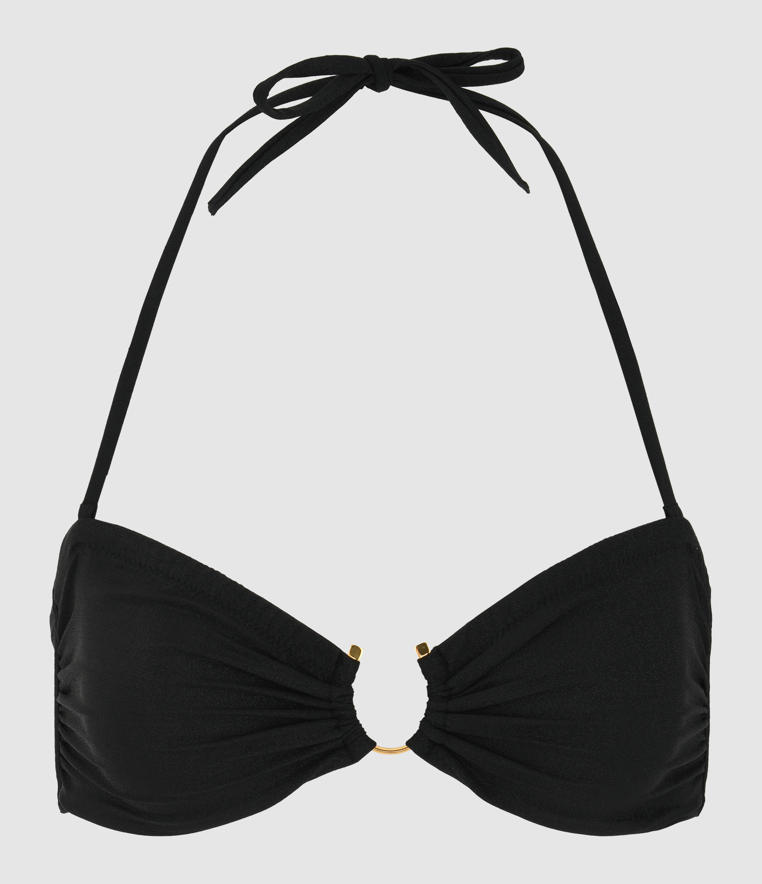 Haut de maillot de bain noir à paillettes dorées. Coupe bandeau. Boucle en forme de U à l'avant.