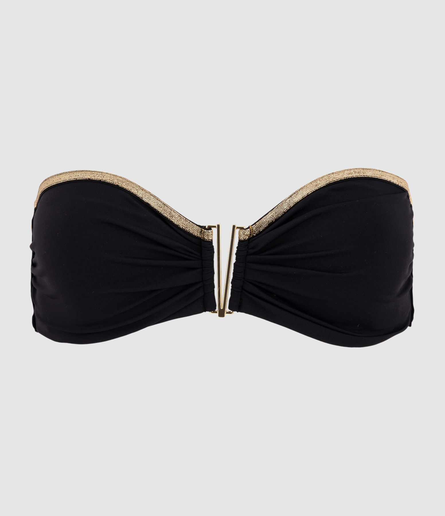 Haut de maillot de bain bandeau noir. Détails dorés. Fermoir dans le dos. Coques amovibles.