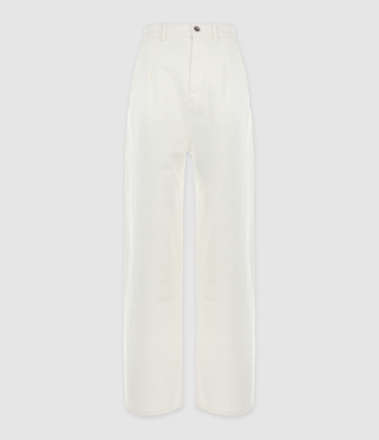 Pantalon à pinces en denim de coton blanc. Taille haute avec passants pour ceinture. Braguette zippée et boutonnée. Bouton métallique. Deux poches italiennes. Deux fausses poches passepoilées dans le dos. Jacron blanc dans le dos. Coupe large. Base droite.