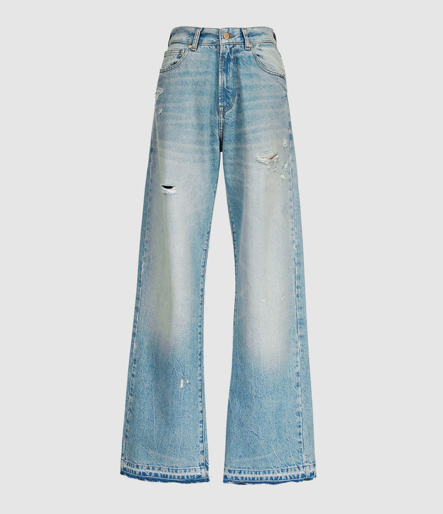 Jean large en denim de coton bleu clair. Effet usé par endroit. Passants pour ceinture. Cinq poches. Coupe boyfriend. Base droite coupée à cru.