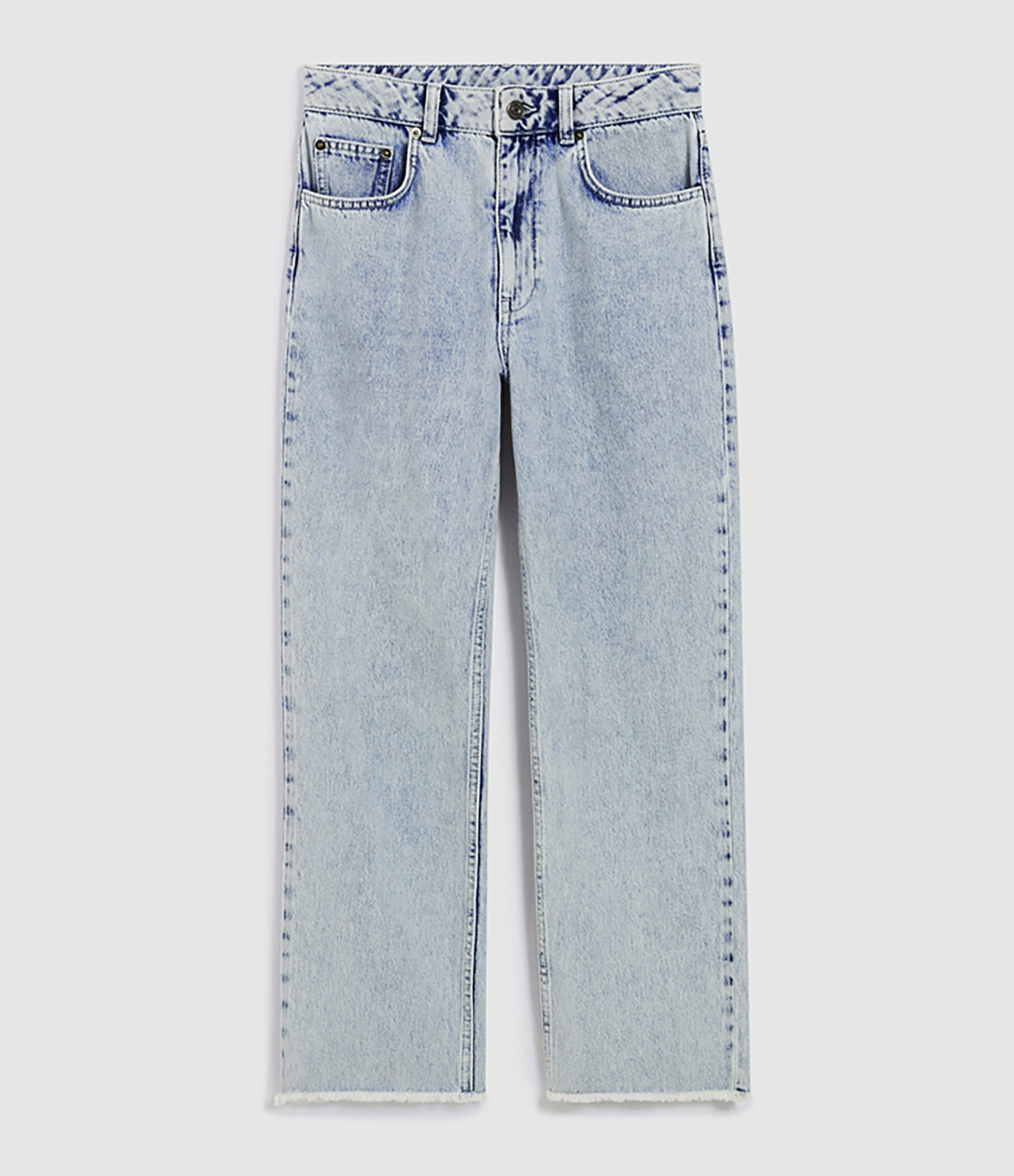 Jean cropped frangé aux chevilles en denim de coton bleu. 5 poches. Effet délavé. Coupe droite. Base droite.