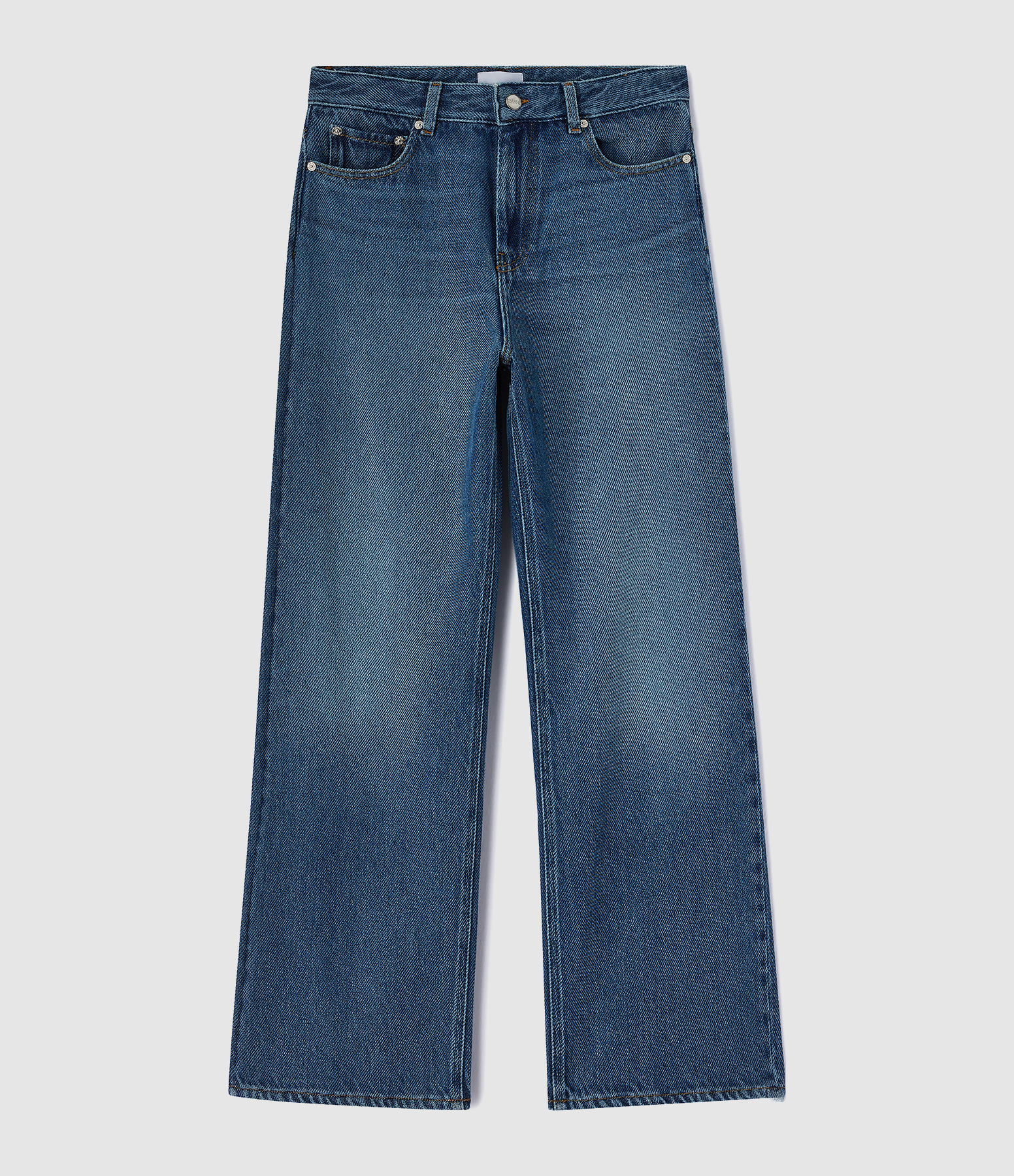 Jean en denim de coton bleu. Passants pour ceinture. Deux poches italiennes sur les cotés, deux poches plaquées dans le dos. Fermeture zippée et boutonnée sur le devant. Coupe droite. Base droite.