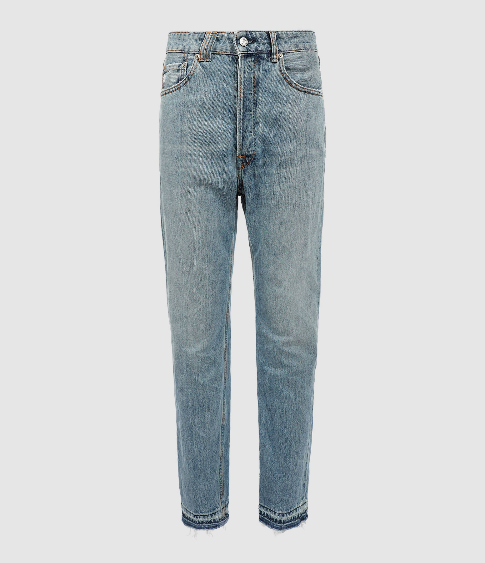 Jean droit en denim bleu clair délavé pour homme. Cinq poches. Fermeture par boutons. Effet usé par endroits. Coupe droite.