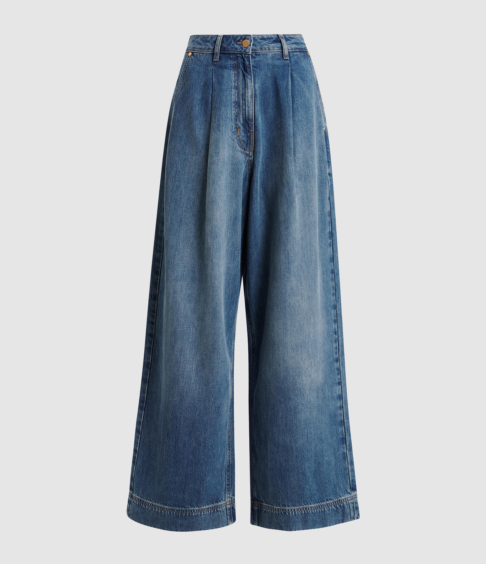 Jean bleu décontracté, à taille haute et jambe large, avec passants de ceinture, fermeture boutonnée et zippée et poches avant et arrière.