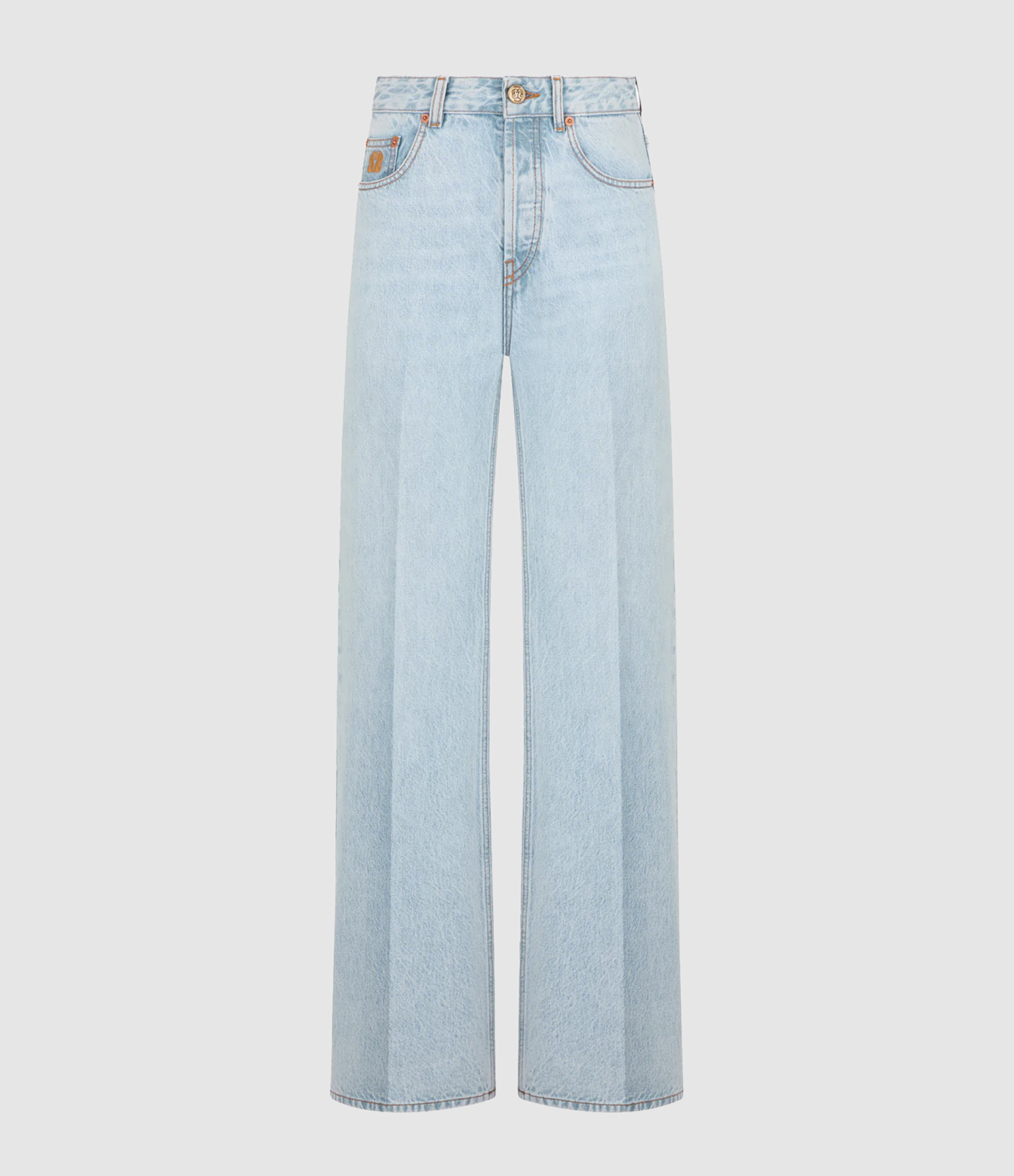 Pantalon évasé pour femme en denim bleu glacier. Taille haute. Jambe légèrement évasée. Cinq poches. Poche gousset avec logo brodé. Pli sur le devant. Fermeture zippée et bouton doré vieilli avec logo. Passants de ceinture.