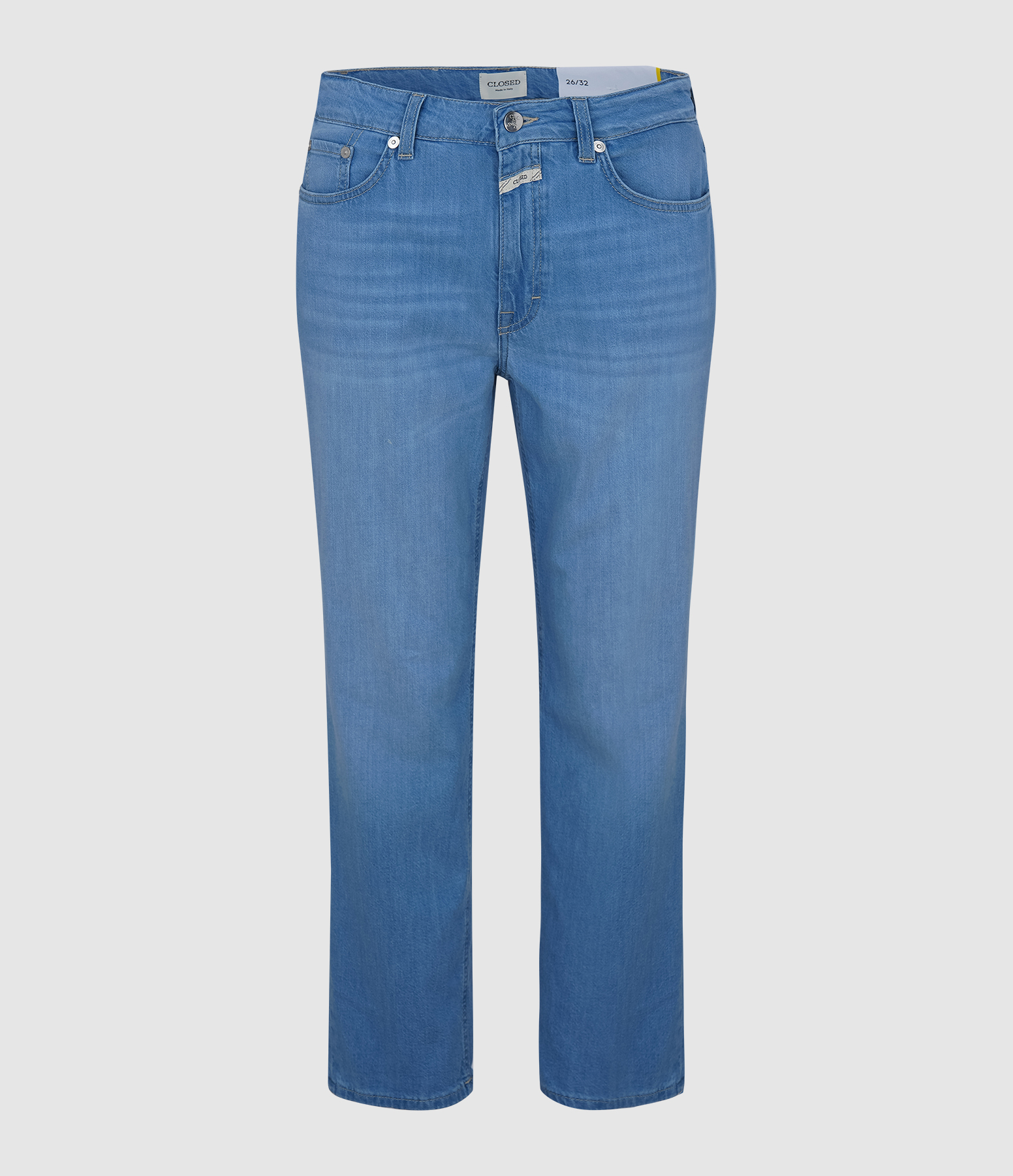 Jean bleu clair, doté d’une braguette à fermeture éclair, de cinq poches, ainsi que de passants de ceinture. Détails de la marque sur le bouton et l'étiquette avant et arrière.