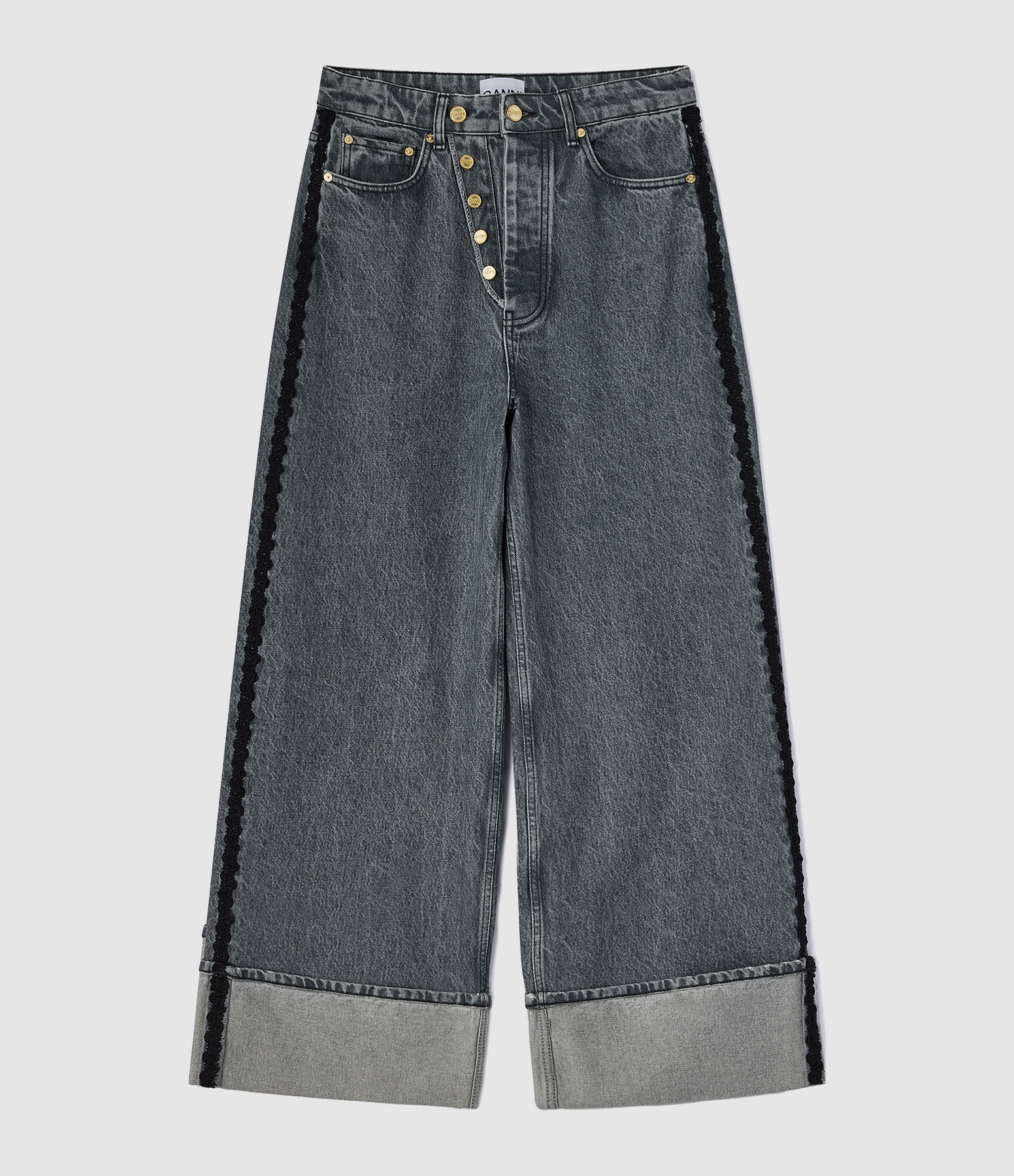 Jean baggy à double braguette en denim gris anthracite. Ourlets retroussés. Détail couture avec bordures en dentelle.