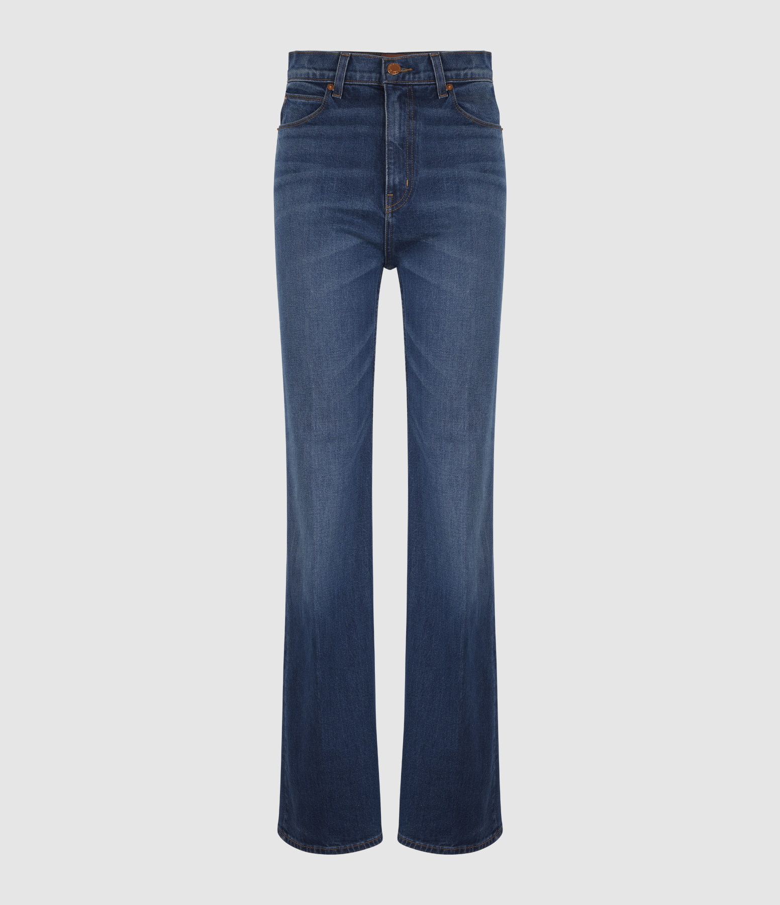 Jean flare revisité, conçu pour allonger et sublimer la silhouette. Jambe en forme de A, taille haute et une coupe qui affine la taille. Il dispose de cinq poches.