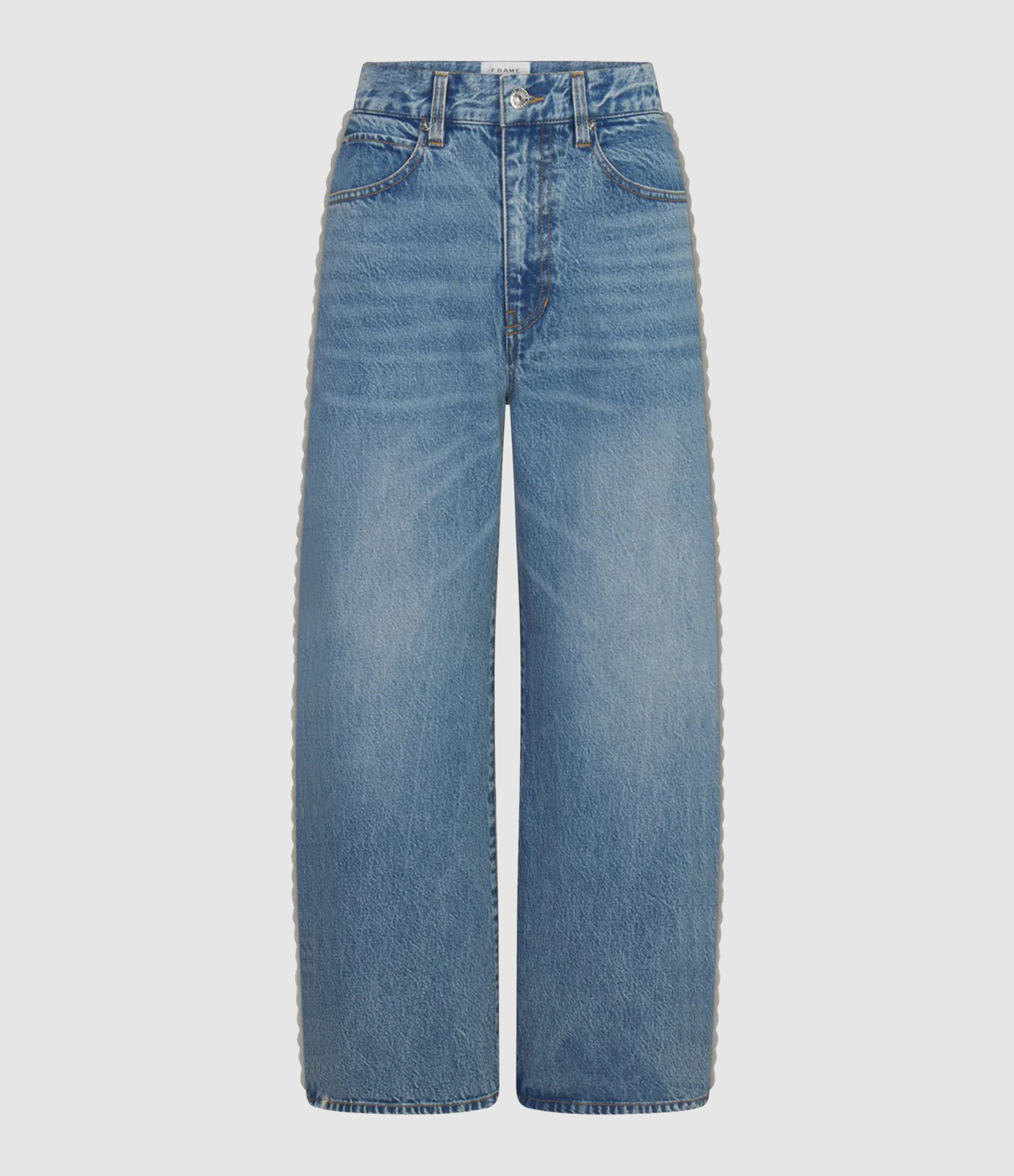 Ce jean court adopte une coupe large. Le long des jambes, un détail festonné en crochet.