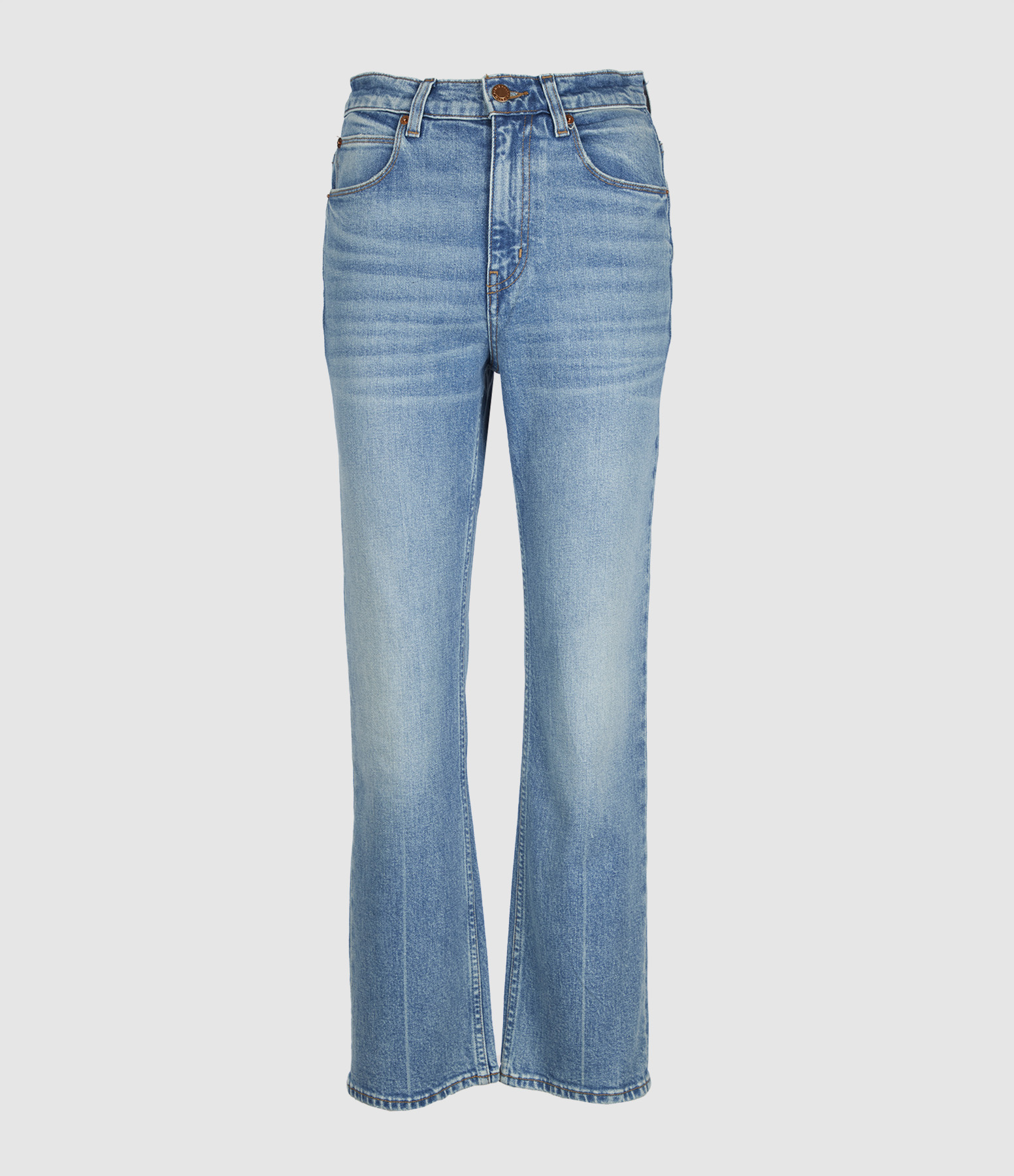 Jean Kenickie, à taille mi-haute et longueur cheville, une couture droite aux hanches affine la silhouette. Il dispose de cinq poches.
