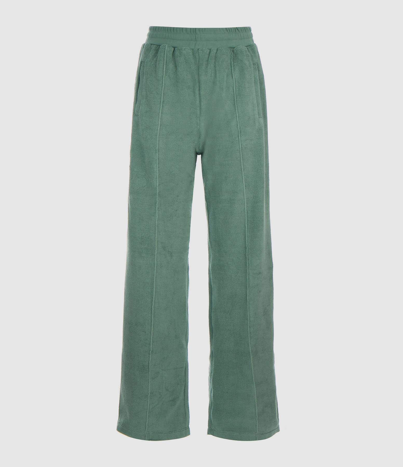 Jogging pour femme en coton vert, effet éponge. Taille élastiquée avec liens de serrage à l'intérieur. Deux poches passepoilées sur les côtés et une poche plaquée avec inscription noire à l'arrière. Coupe large.
