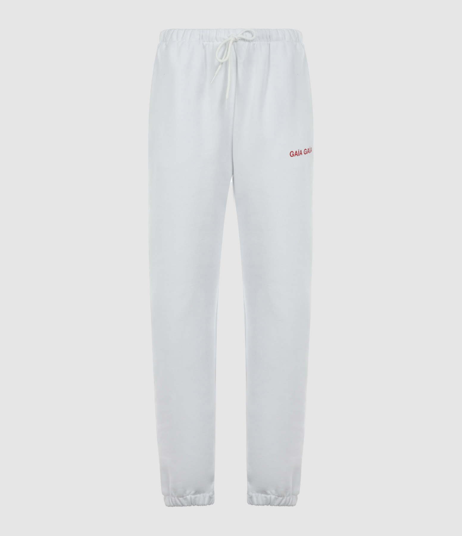 Jogging en coton blanc. Taille élastiquée avec liens de serrage. Logo rouge "GAIA GAIA" floqué sur la jambe gauche et inscription rouge floquée sur la jambe droite. Deux poches fendues et une poche plaquée à l'arrière. Chevilles élastiquées. Coupe droite.
