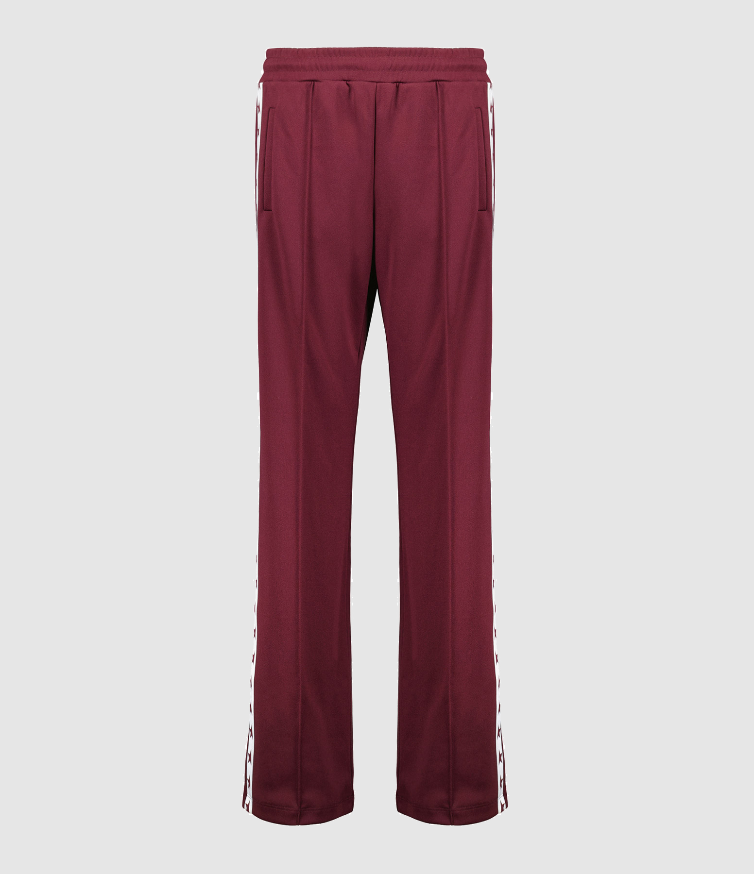 Pantalon de jogging bordeaux. Taille élastiquée avec liens de serrage à l'intérieur. Bandes blanches en gros grain avec série logos étoiles bordeaux sur les côtés. Deux poches passepoilées sur le devant. Une poche plaquée dans le dos. Coupe large. Base droite. Non doublé.
