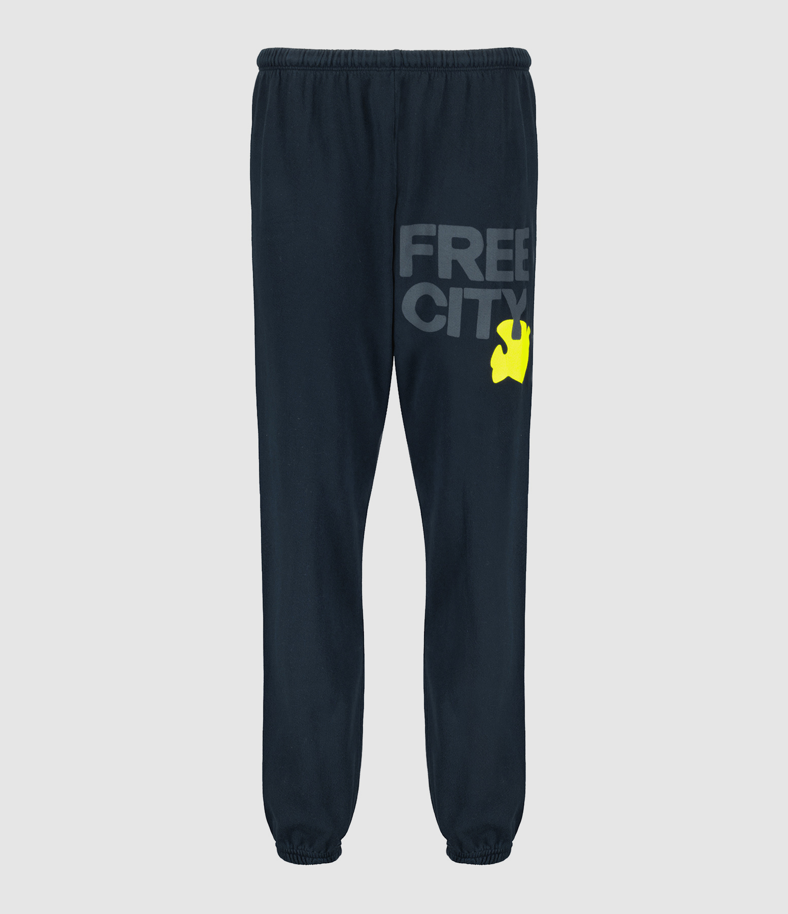 Pantalon jogging en coton molletonné bleu foncé avec le logo Free City flocké sur le devant en noir et jaune. Taille élastiquée avec cordon de serrage. Coupe droite. Base droite resserrée et élastiquée.
