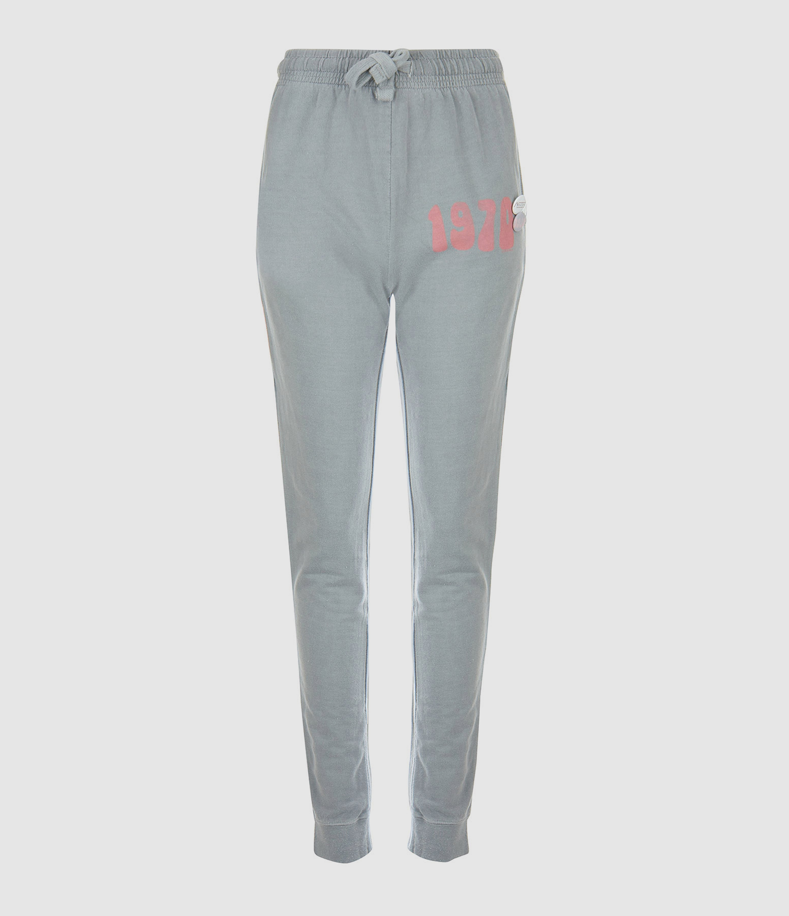 Pantalon de jogging doux en coton gris clair. Inscription "1970" rose. Deux pin's. Taille élastiquée avec liens de serrage. Deux poches fendues sur les côtés.