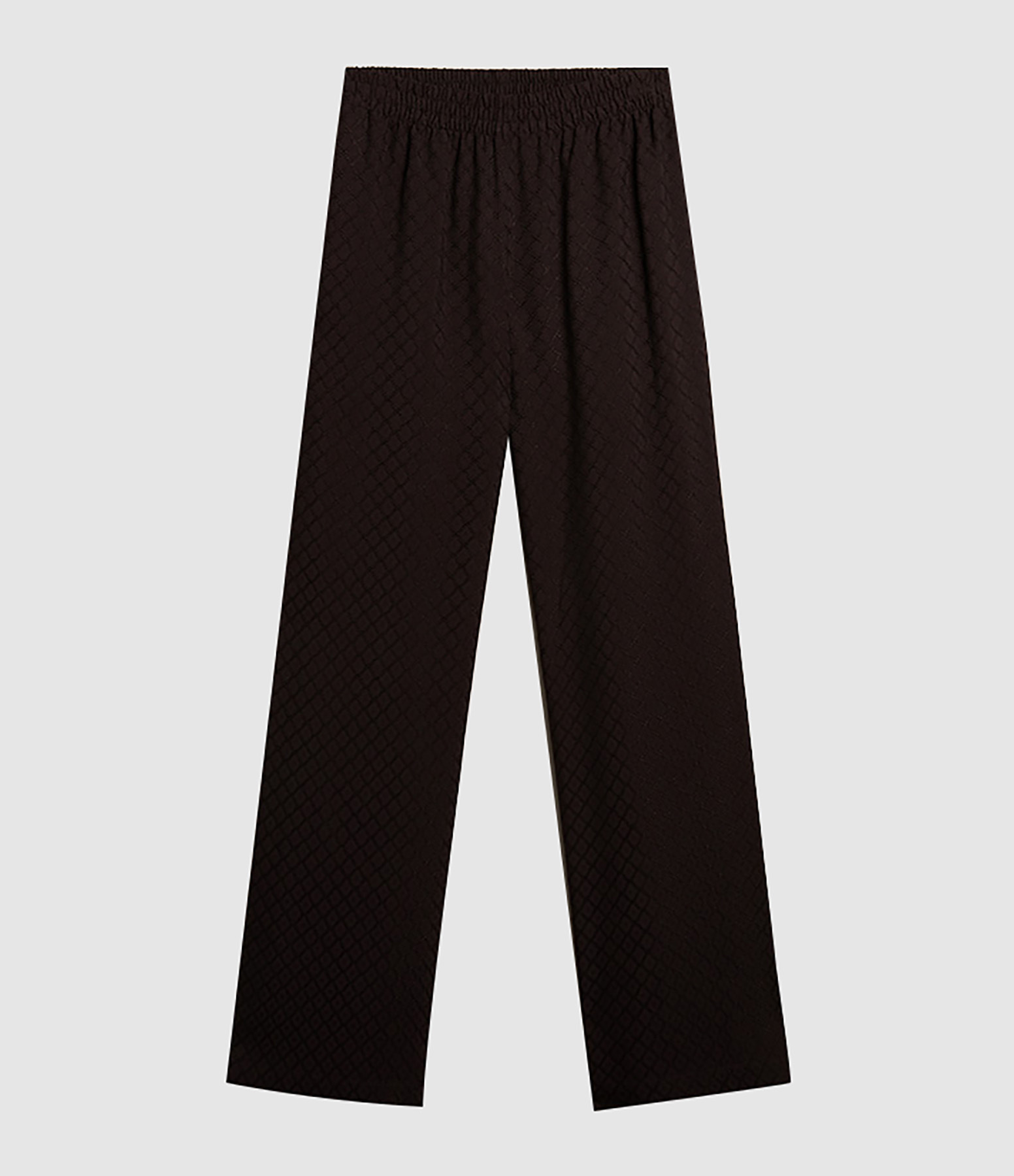 Jogging fluide noir. Taille élastiqué. Deux poches latérales prises dans les coutures. Coupe droite. Base droite.