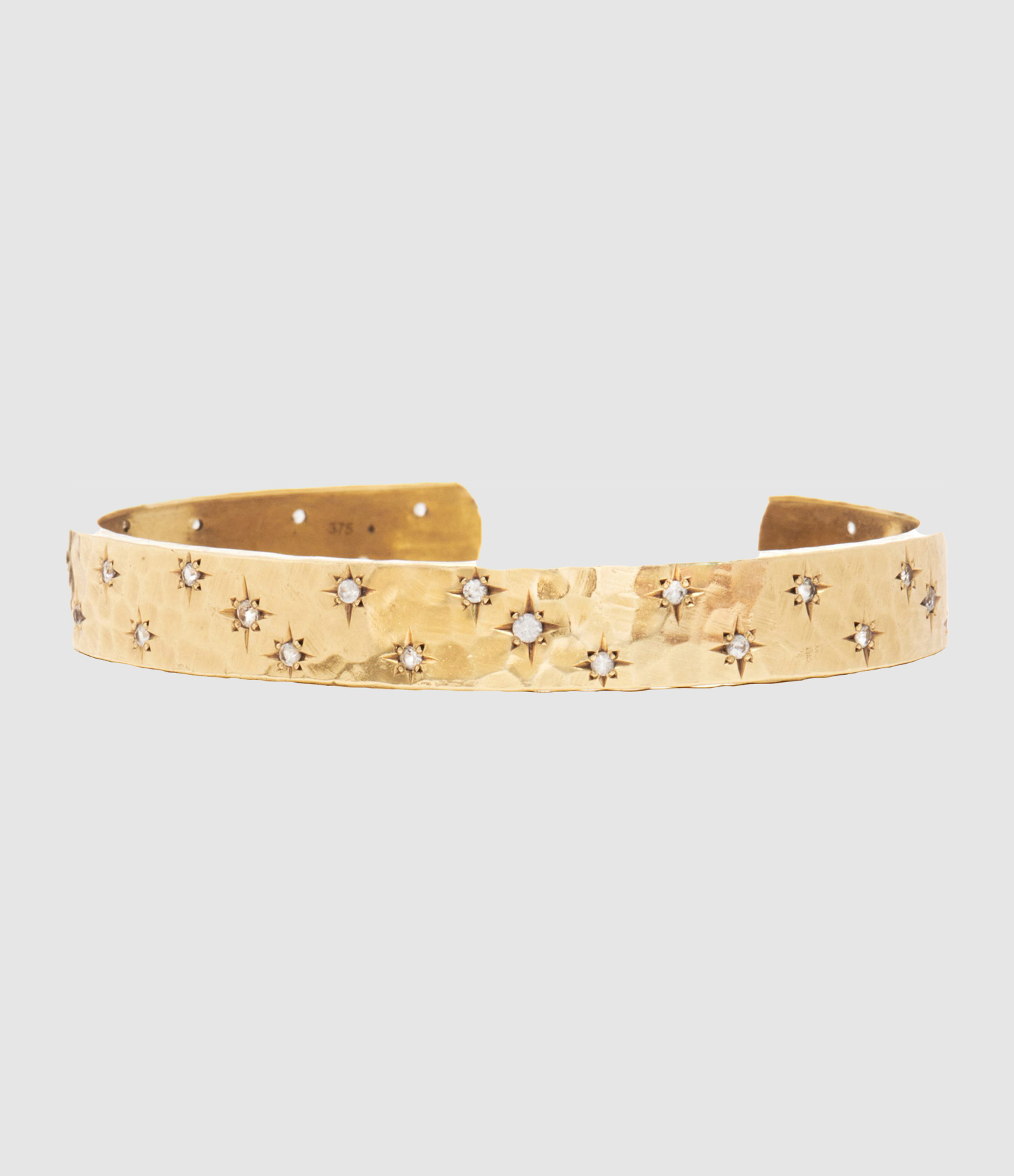 Jonc en or jaune avec motifs soleil serti de 35 saphirs blancs.