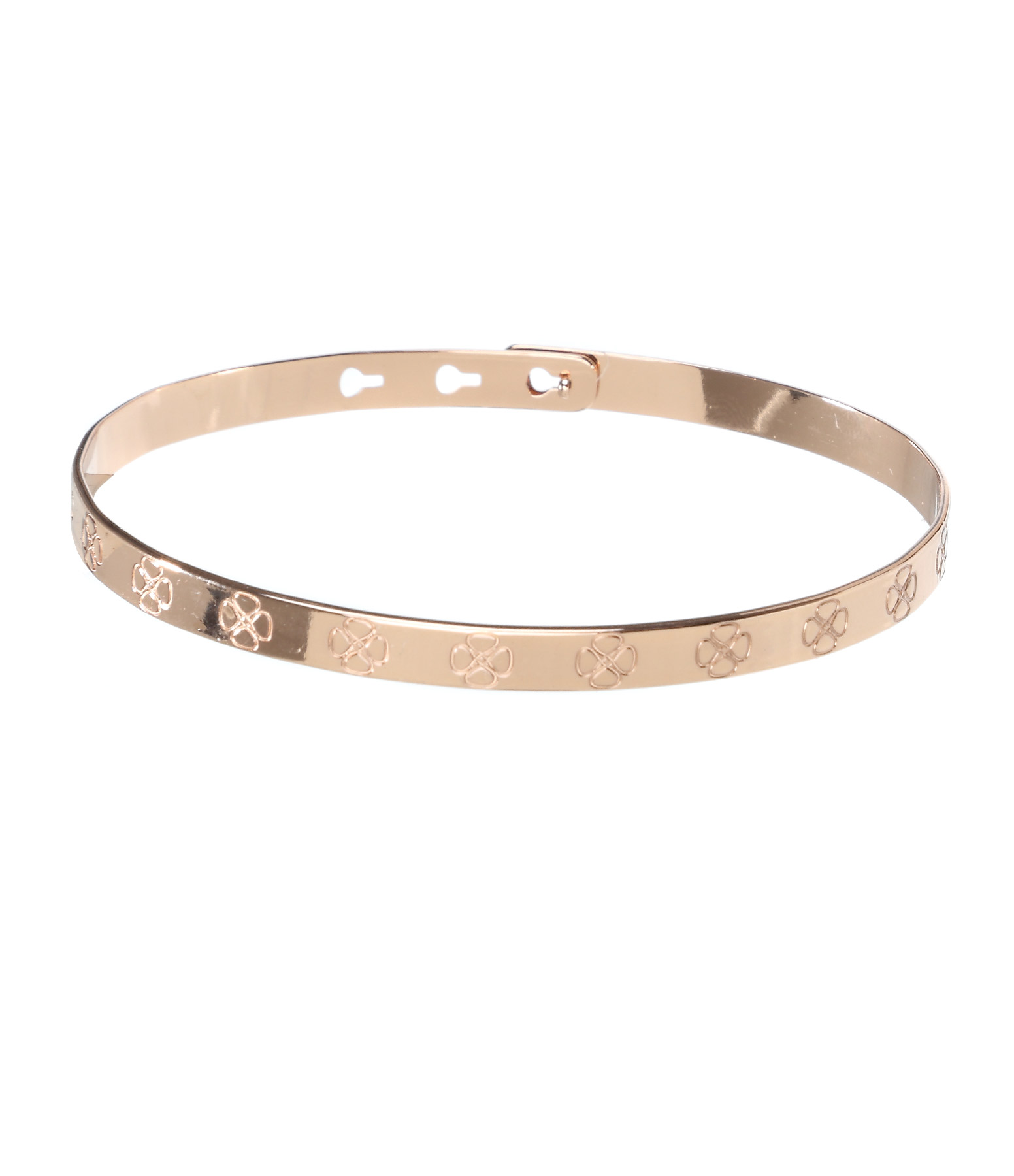 Jonc en laiton plaqué argent, or jaune ou rose. Gravure du trèfles Lulli. Fermeture réglable sur trois niveaux. Signé "Mya Bay".
