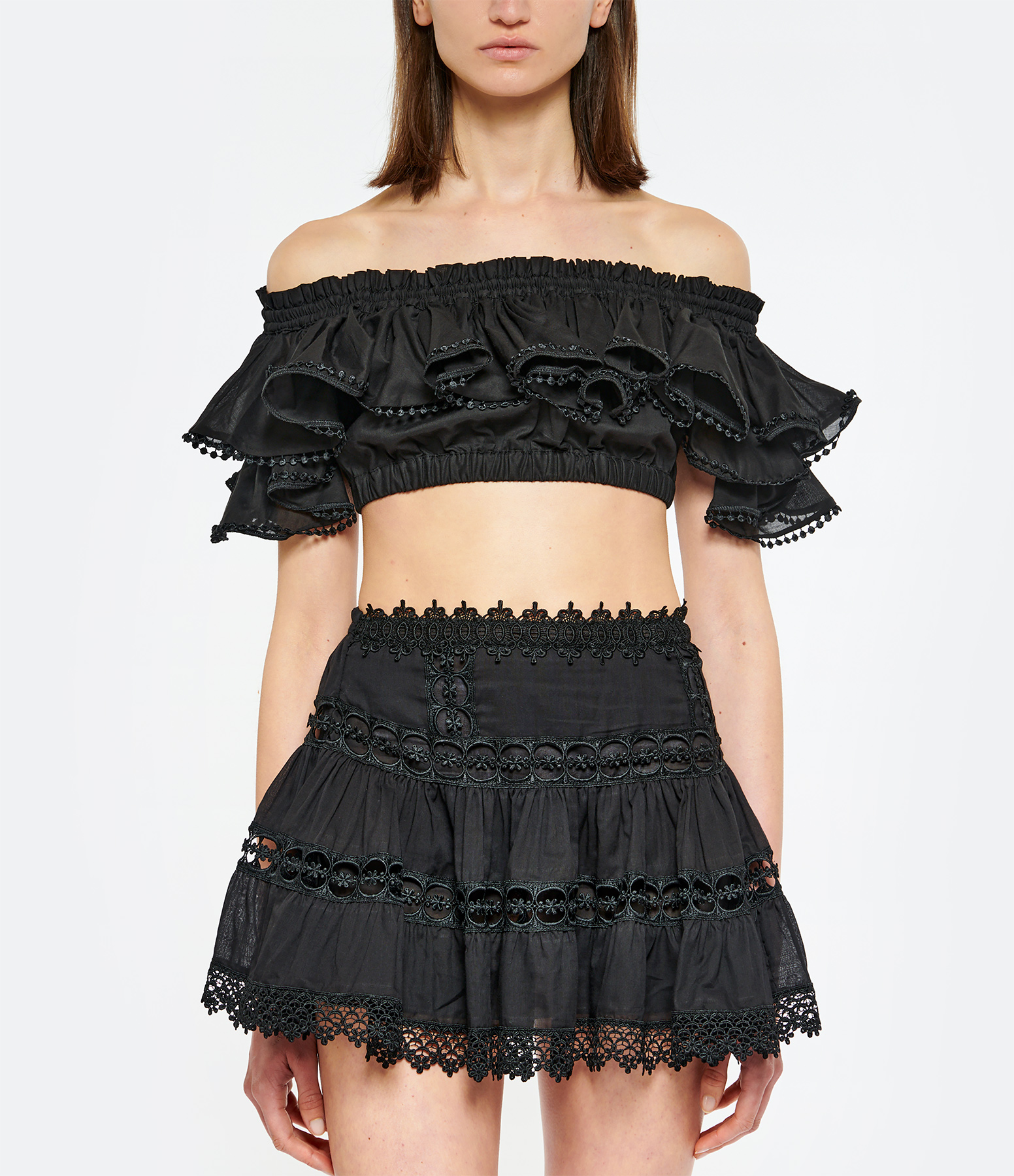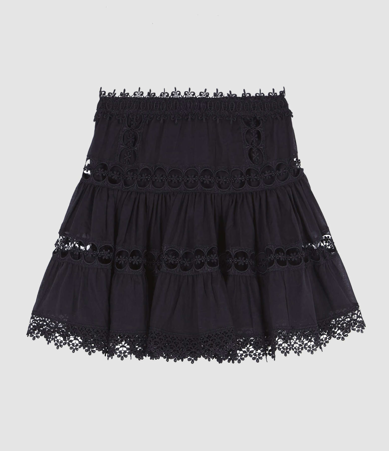 Jupe courte noire dentelée. Taille élastiquée. Coupe évasée. Base dentelée. Doublée.