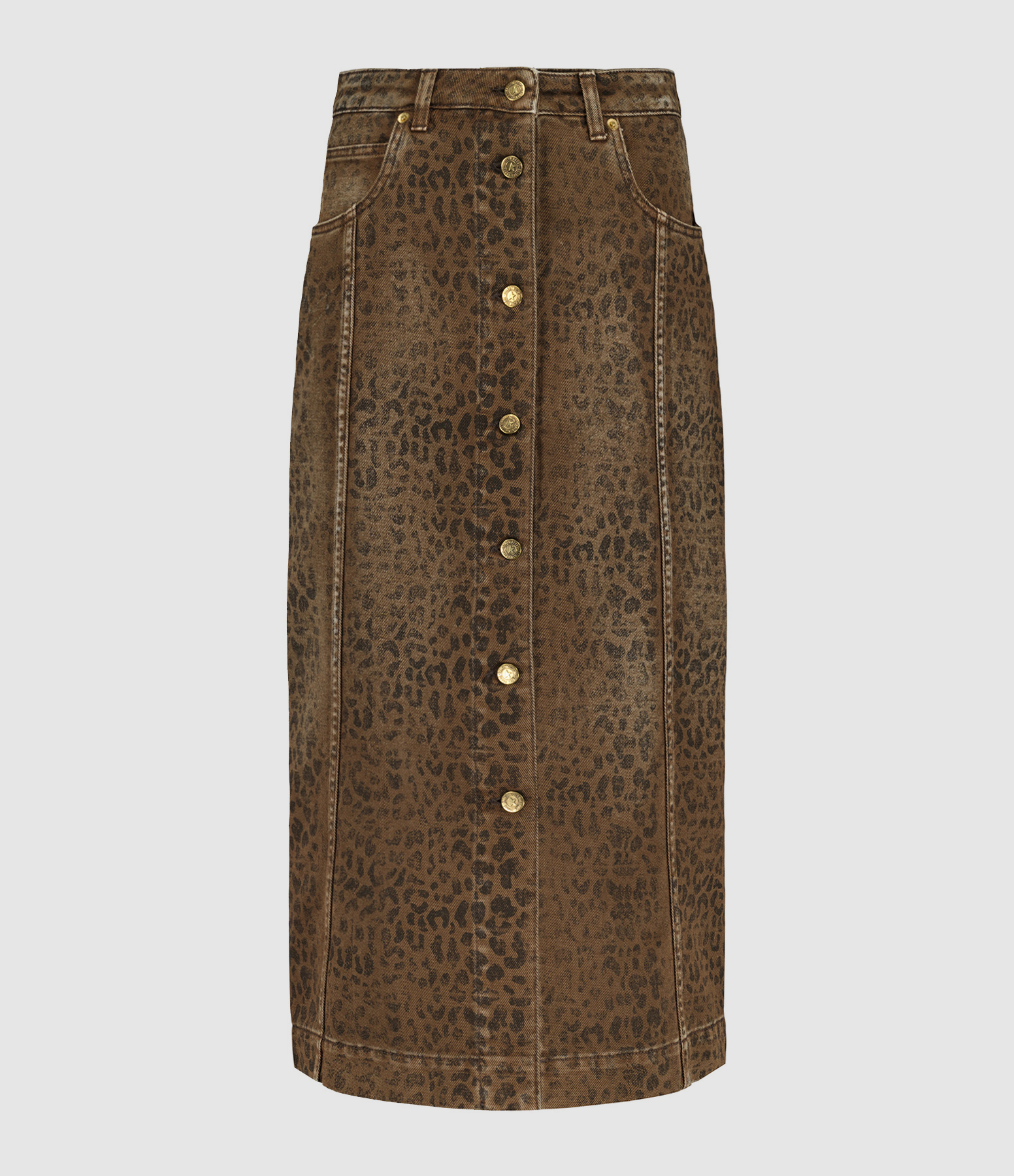 Jupe crayon en denim imprimé léopard. Longueur midi. Taille haute. Fermeture boutonnée simple sur le devant. Boutons métalliques gravés du logo GOLDEN GOOSE. Passants pour ceinture. Deux poches italiennes et une poche à gousset sur le devant. Deux poches plaquées dans le dos. Pièce amovible blanche avec la lettre "G" rouge brodée cousue sur la poche gauche arrière. Coupe crayon. Base droite.