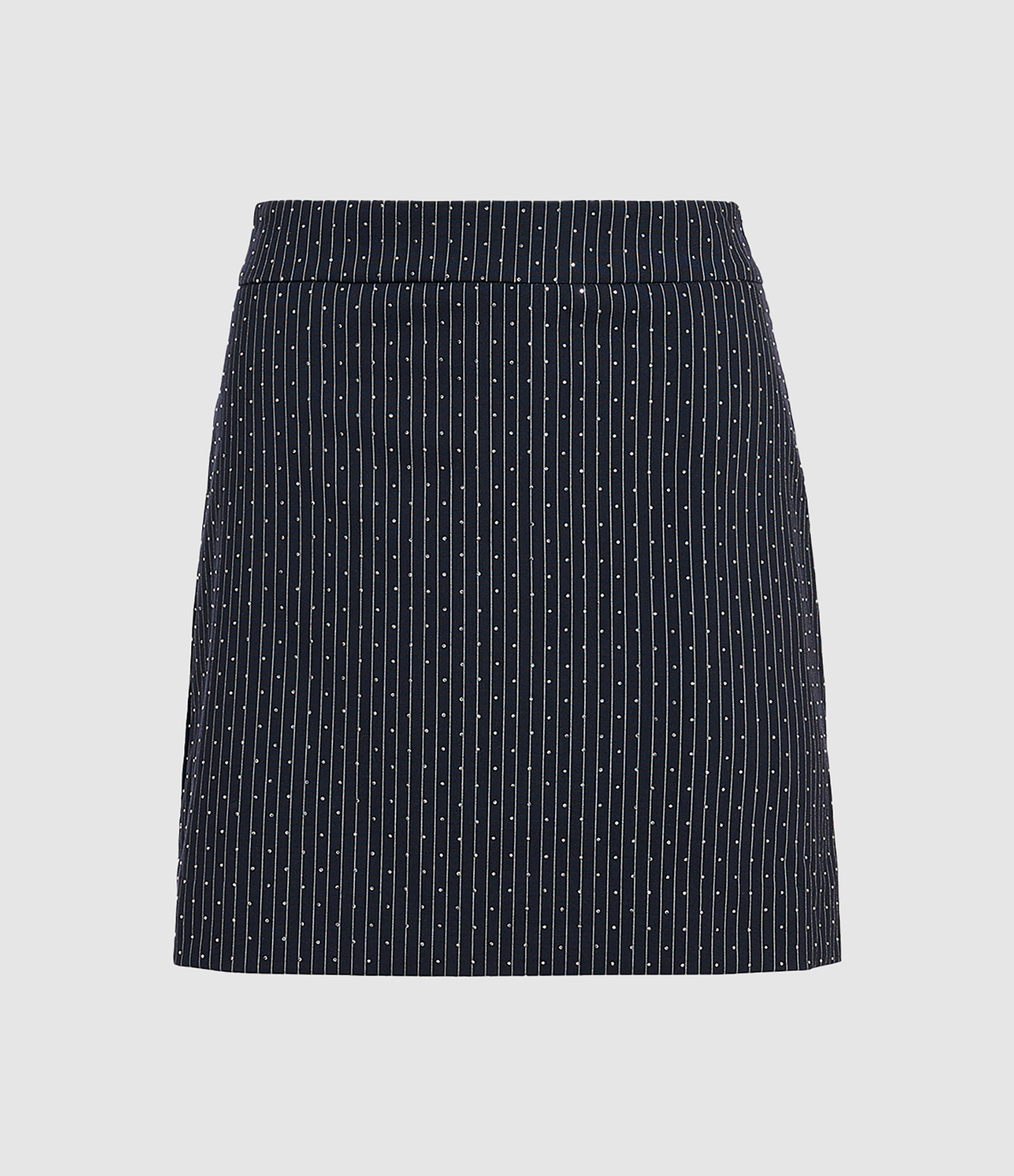 Jupe courte bleue à fines rayures blanches. Strass sur l'ensemble. Fermeture par zip sur le côté. Fente asymétrique à l'arrière. Coupe trapèze. Base droite.