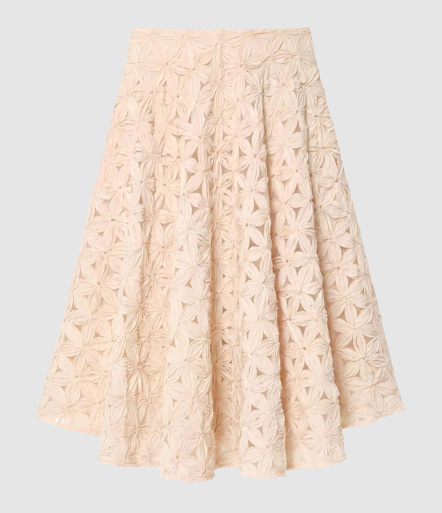 Jupe mi-longue beige possède une coupe évasée et volantée. Elle est entièrement recouverte de motif grosses fleurs en relief. Fermeture par un zip invisible au côté.