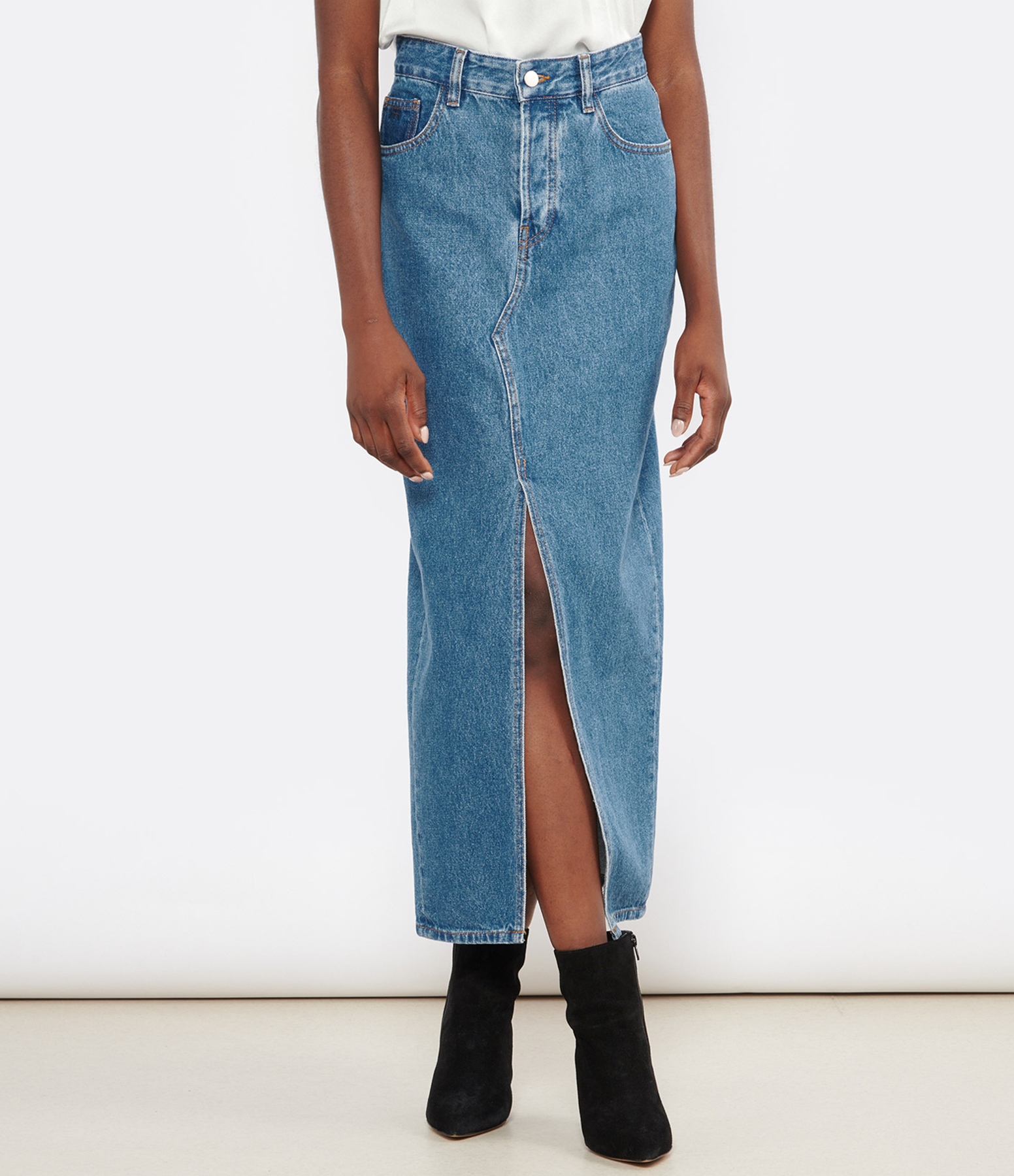 Jupe longue en denim de coton bleu. Taille haute avec passants pour ceinture. Fermeture boutonnée. Cinq poches. Logo RR brodé ton sur ton sur la poche à gousset. Coupe droite. Base droite fendue jusqu'à mi-cuisses sur le devant.
