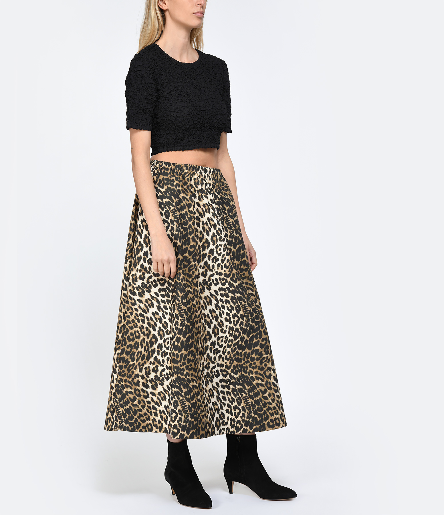 Jupe longue en coton à imprimé léopard. Taille élastiquée. Coupe évasée. Base droite.