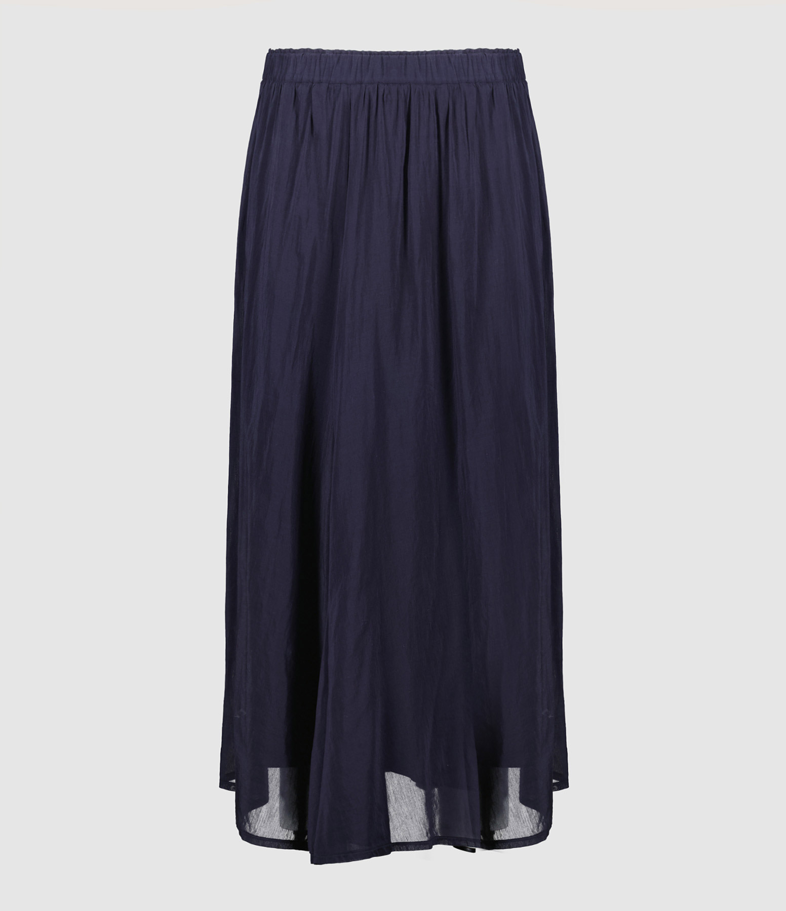 Jupe longue bleue. Taille élastique. Doublée. Coupe évasée. Base arrondie.