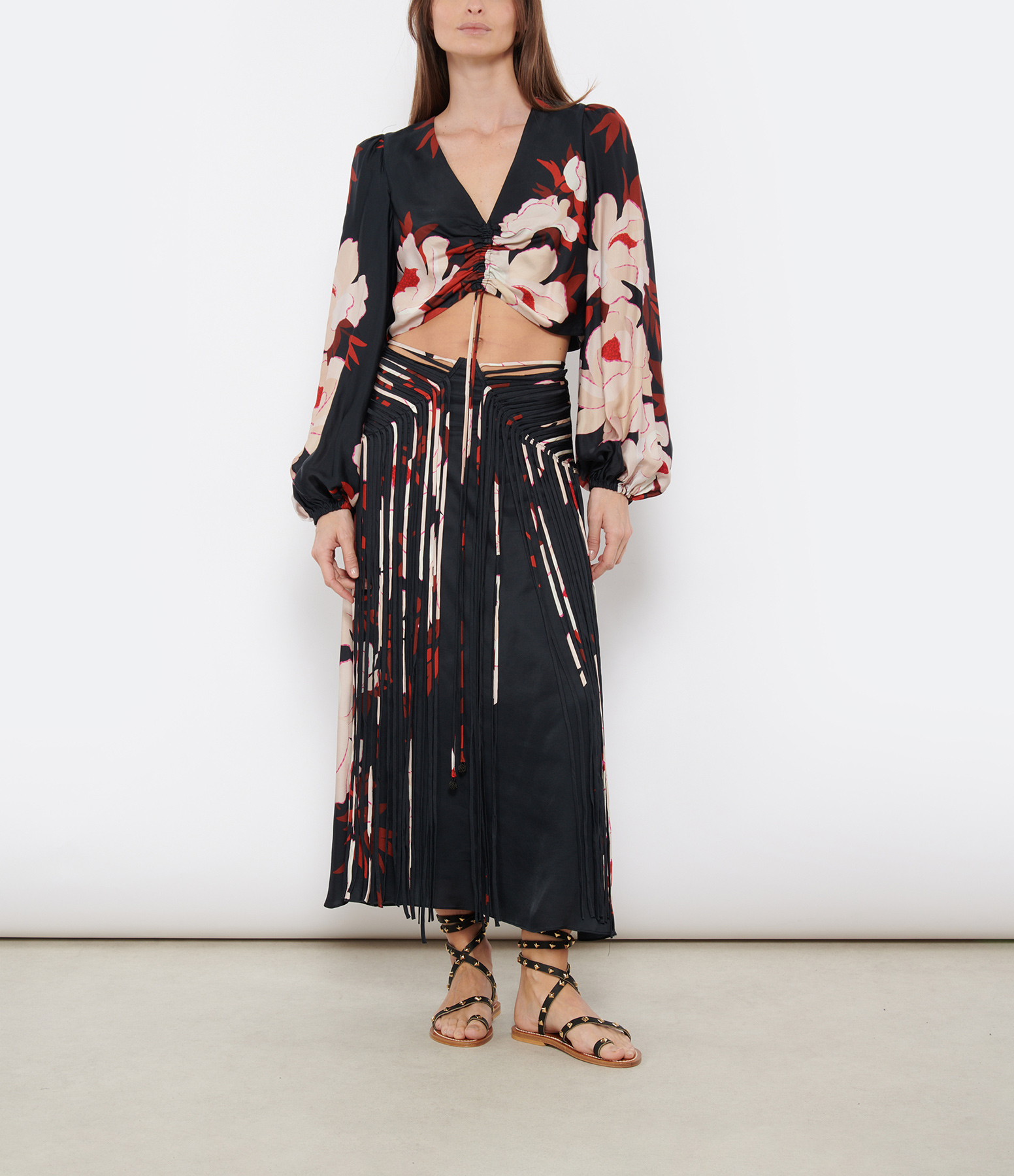 Jupe longue noire à imprimé fleuri. Franges à l'avant. Fermeture par zip à l'arrière. Coupe droite. Base droite.