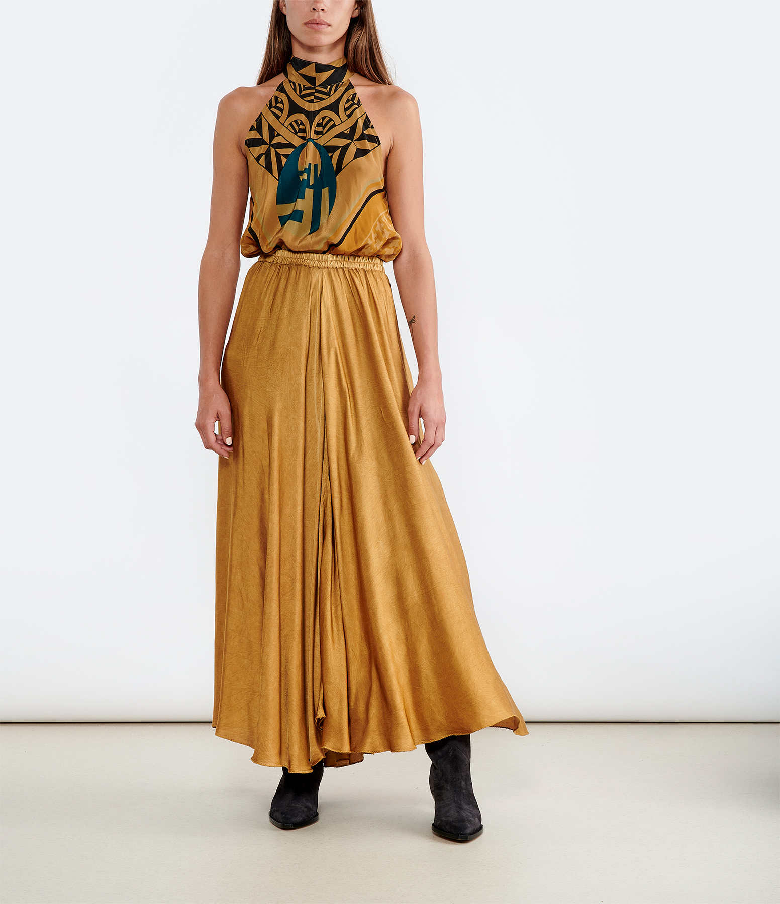 Jupe longue ocre. Taille élastiquée. Coupe ample. Base arrondie.